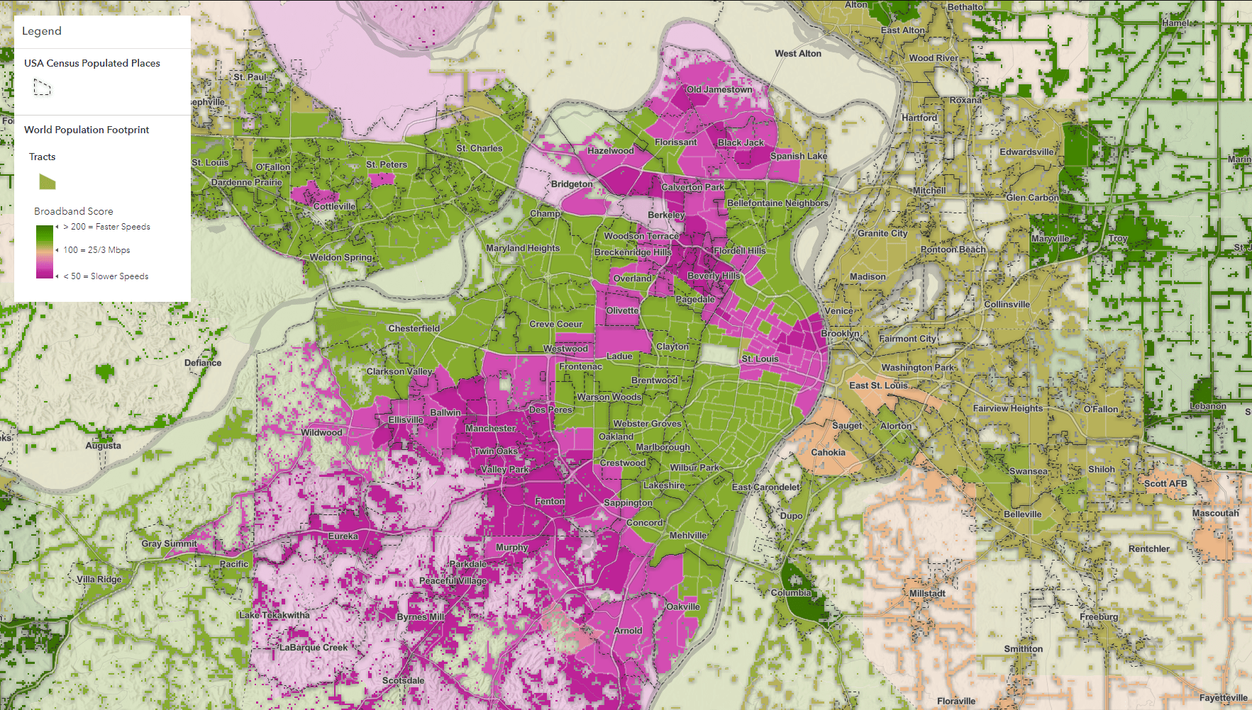 This can be accomplished in Arcade with some minor adjustments to the existing broadband score calculation (explore the expressions in the map within the pop-up configuration for the population places layer). The result is a useful broadband score based on the aggregation of average speeds of all blocks within St. Louis, giving an estimated picture of how good or bad broadband access is. It is tempting to take a straight average of all the blocks within a given city boundary, but how does this accurately reflect our cities, villages, or towns when the population is not considered in the analysis?
