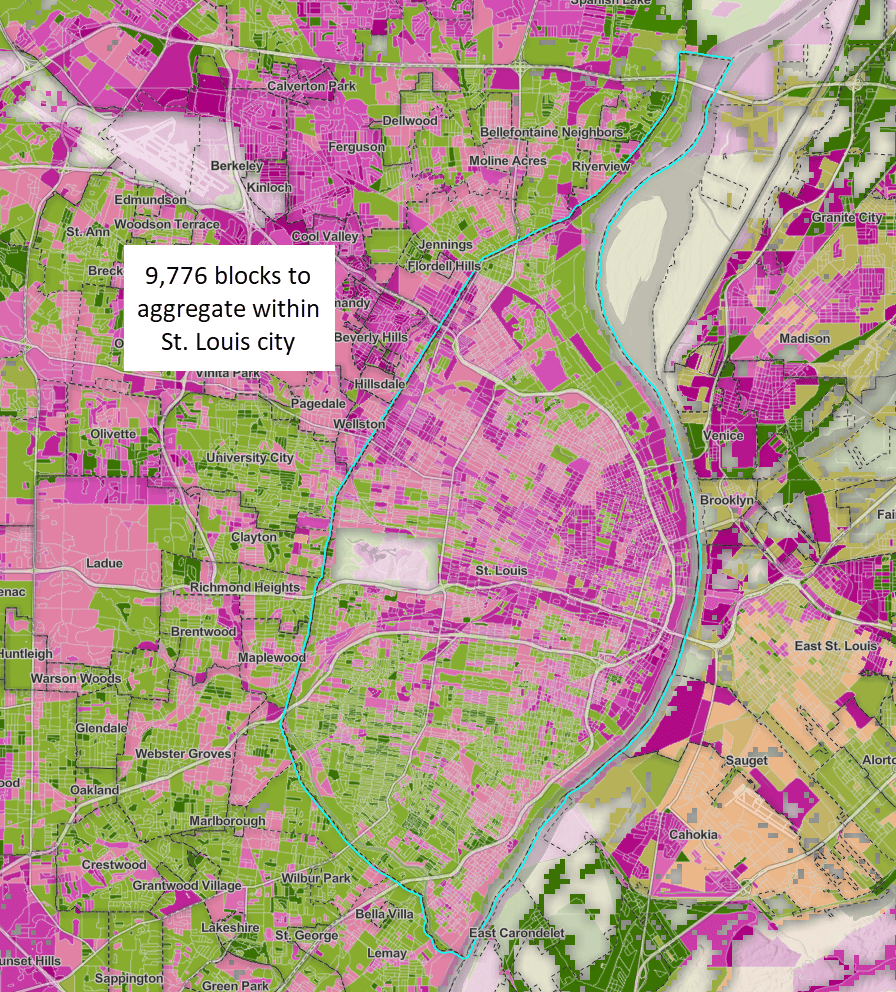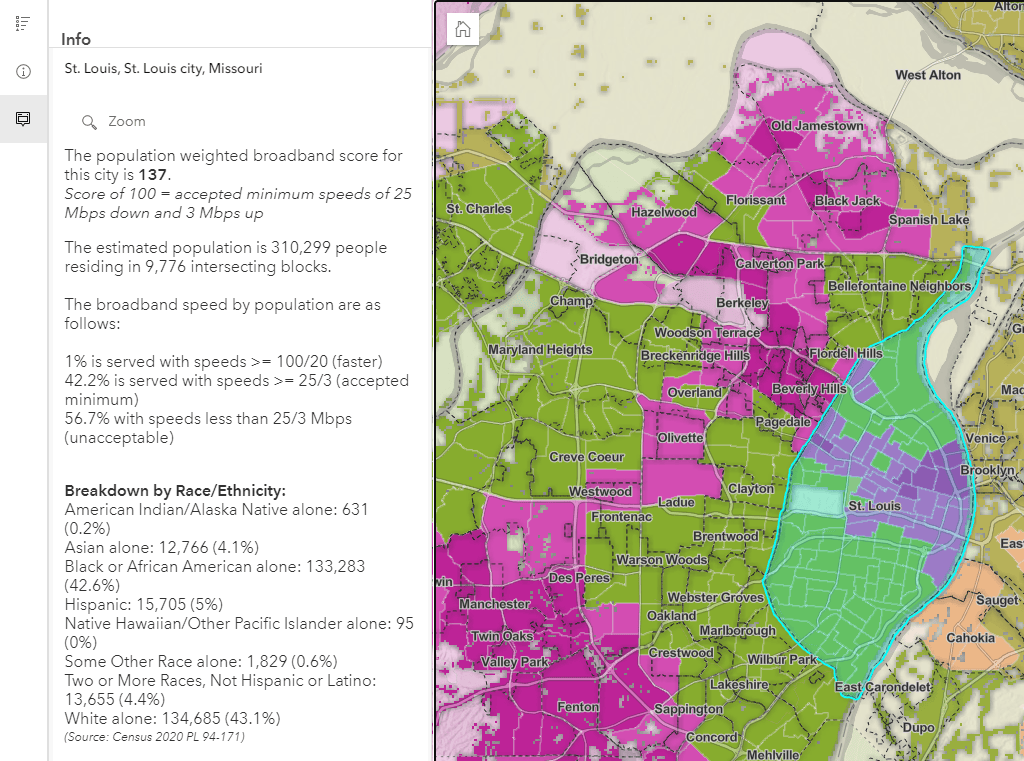 We need a way to summarize the blocks within a given city, village, or town that accurately accounts for the broadband speeds experienced by people in the larger geographies. With this geographic approach in mind, the pop-up for this map takes the analysis a few steps further. Start with exploring St. Louis, Missouri. In order to understand broadband access for St. Louis, we need to summarize the intersecting blocks within the city boundary.
