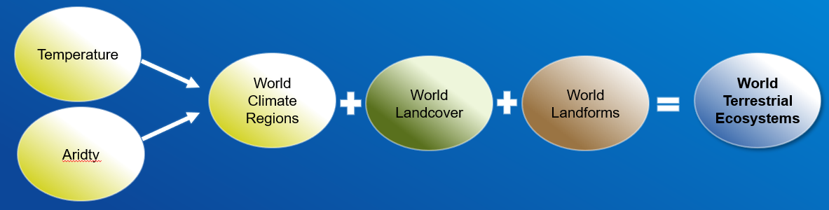 In 2020, with a collaboration of The Nature Conservancy (TNC), United States Geological Survey (USGS), and Esri, we developed 250 meter resolution World Terrestrial Ecosystems 2015 (WTE). Terrestrial ecosystems are land-based environments where plants, animals, and microorganisms interact with each other and their physical surroundings. The World Terrestrial Ecosystems (WTEs; Sayre et al., 2020) are a set of 431 ecosystems (or 1,776 ecosystems when stratified by biogeographic regions) conceptualized and mapped as distinct combinations of World Climate Region, generalized Hammond landform type, and European Space Agency (ESA) Global Land Cover for the year 2015.