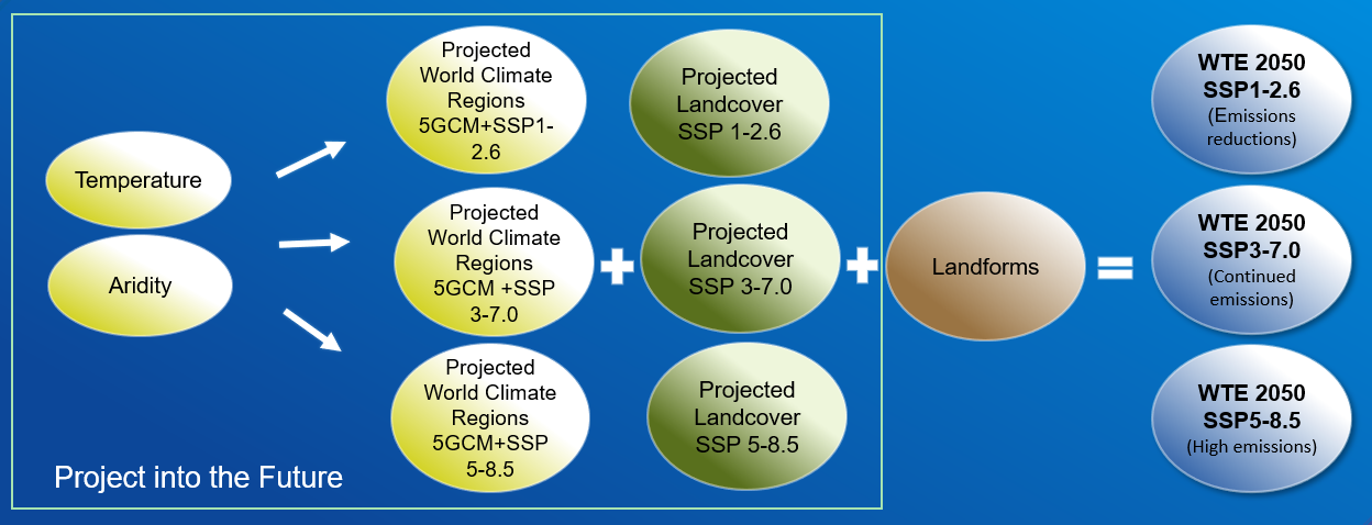 The climate region, global vegetation and land cover, and landforms inputs were then combined to assign a WTE classification per SSP following the original WTE typology described in Sayre et al. (2020). The five 2050 WTEs for each SSP. To simplify outputs and derive one final, predominant WTE for each SSP, we applied a majority rule across all five 2050 WTEs per SSP to identify that which occurred most frequently. We produced three projected WTEs based on three SSPs and GCMs.