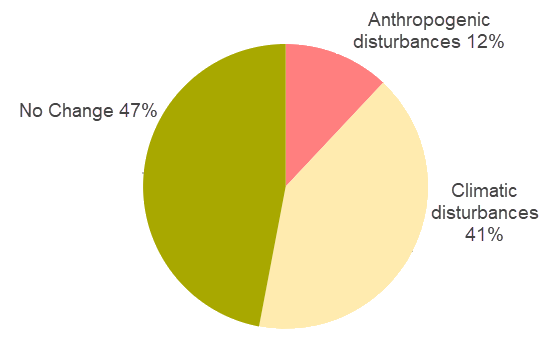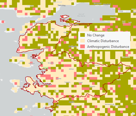 We created a set of change layers that indicate whether a change occurs and, if so, what type of change occurs. We used these layers to determine the percentage of olive trees located within different types of ecosystem disturbance areas in 2050.