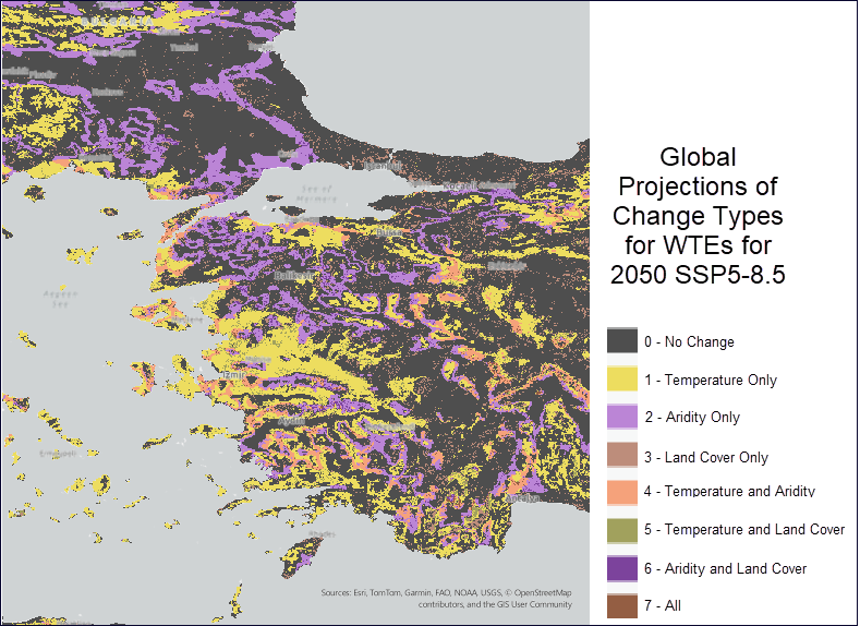 By analyzing the 2015 and projected 2050 World Terrestrial Ecosystems (WTE), we observed potential global climate changes in ecosystem types. This analysis forms the basis of our study, using the Projected Change Types for WTEs in 2050 (SSP5-8.5) layer. This layer shows the types and combinations of modeled changes to WTEs from 2015 to 2050 under the CMIP6 SSP5-8.5 emissions scenario. We used this data to identify the drivers of ecosystem change in our model and to calculate the impact on olive trees within those drivers.