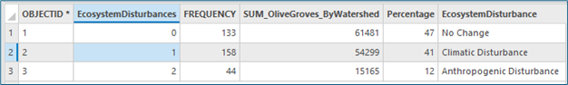 Now, using the Summary Statistics tool, we calculated the sum of the percentage of olive farms within each of these ecosystem disturbance zones or that zones that see no change over time.