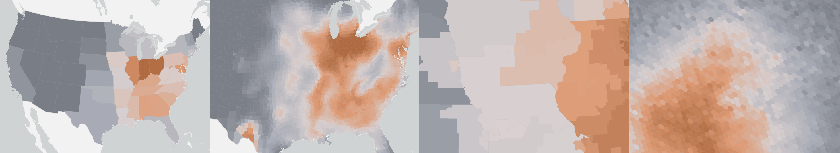 Initially, you can see which states are meeting the target, but if you zoom in, you will gain increased detail. You’ll see the same pattern at the county level, and then as you continue to zoom in you will also see which congressional districts and 50km hex bins meet the target.