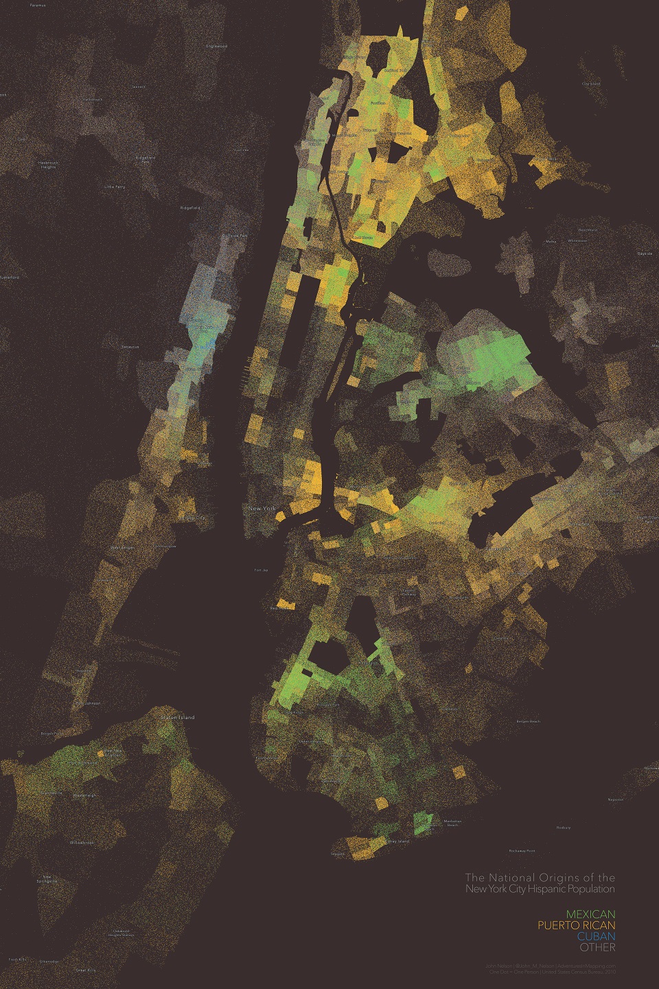 Here, for example, is a Dot Density map of the Hispanic population of New York City. Each dot represents one person. A one-to-one mapping. The visual impression of the overall density of the dots is the variable terrain of the overall population of Hispanic persons. The hue tied to each point, each person, represents their national origin.