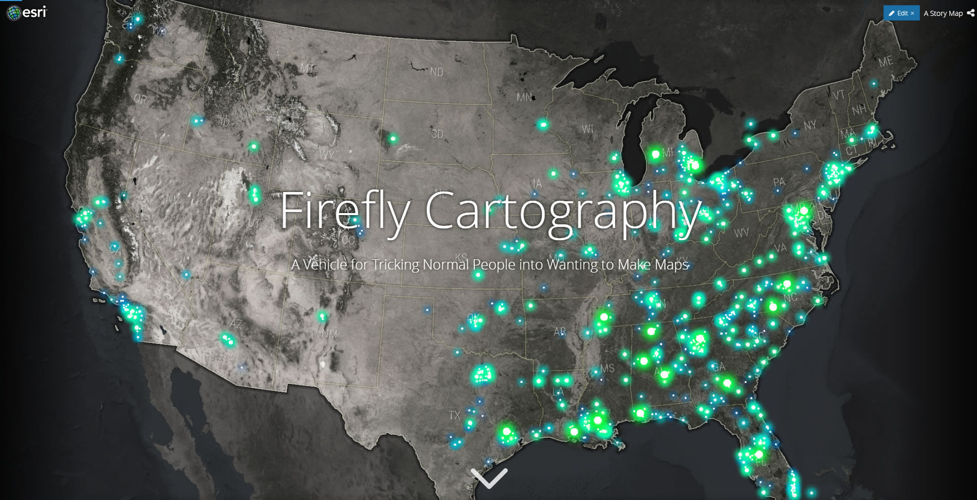 This blog post represented the bloggy introduction of Firefly cartography. Hack? Yes, Firefly is a brain hack! Should you click on this link? No! Why? Because this basemap is pre-crunched and now available to you as a tiled map service! And the glowing firefly symbols are now baked into ArcGIS Online!