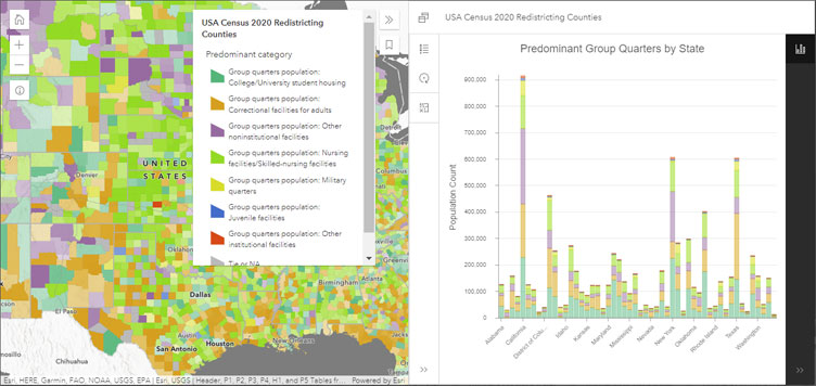The following apps display Census 2020 maps and layers using the Chart Viewer Instant App, delivering an interactive map and chart experience to explore the data.