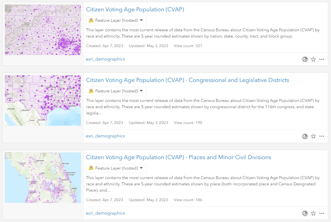 We are happy to announce that CVAP items are now available in ArcGIS Living Atlas. These layers are here to support the important work that many GIS analysts are doing: working to eliminate inequities and ensure voting legislation is not being violated.