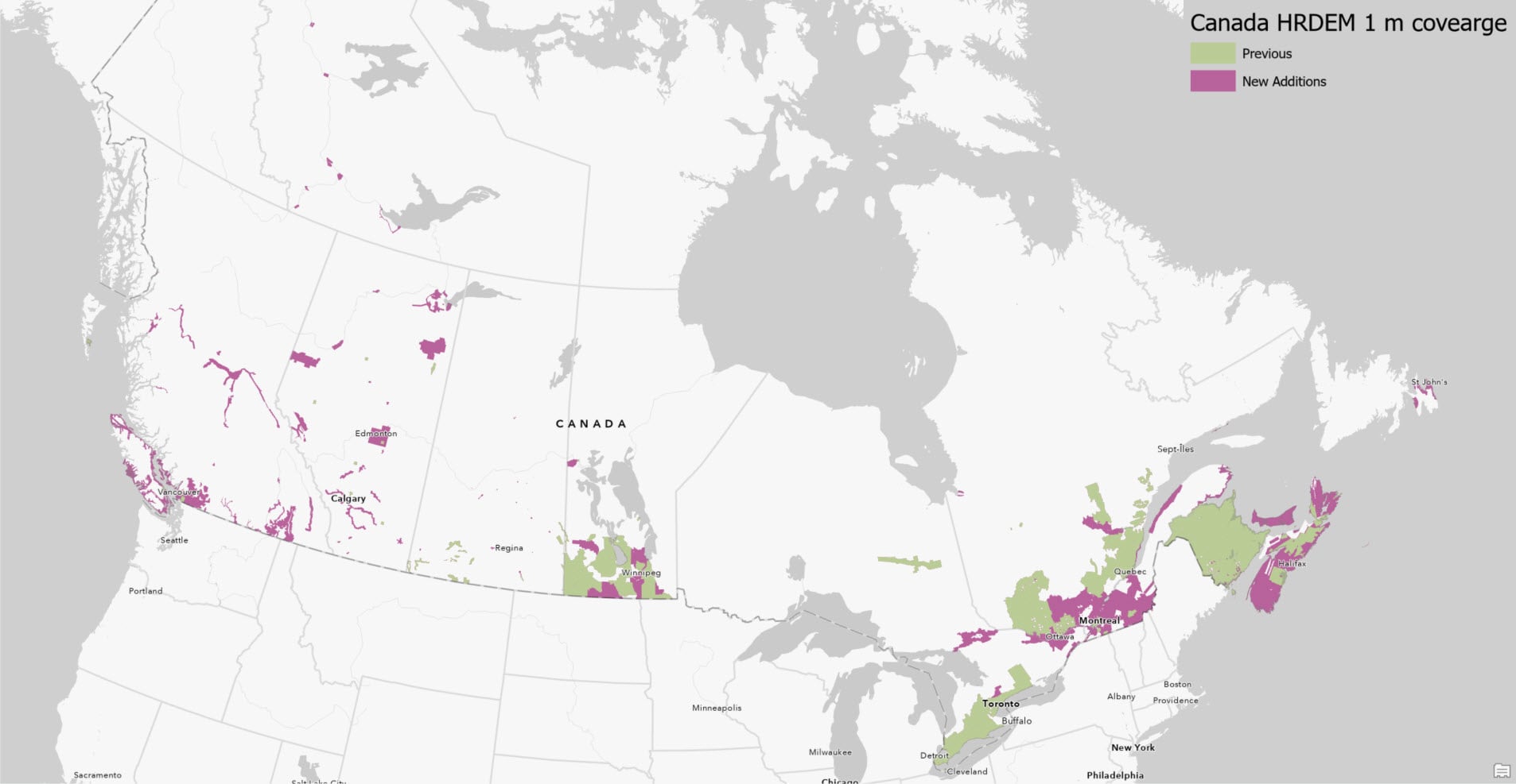 - Natural Resources Canada’s (NRCan) LiDAR derived High-Resolution Digital Elevation Model (HRDEM) of 1 meter. In this release over 200,000 km² new data has been added, which brings total coverage of HRDEM to nearly 500,000 km² spanning across ten provinces (see map below). With the addition of this data, 84 of Canada’s 100 largest cities are covered by the HRDEM.