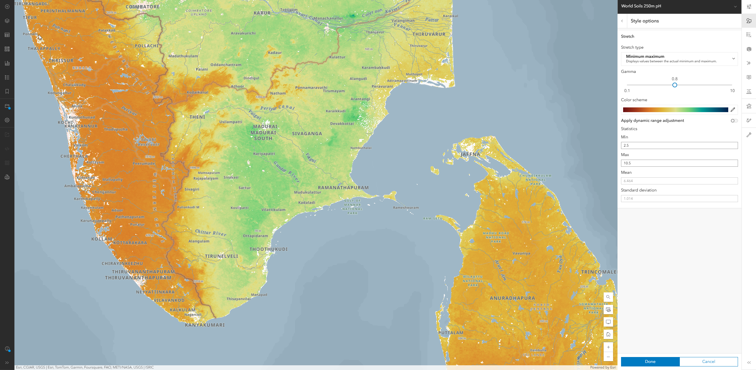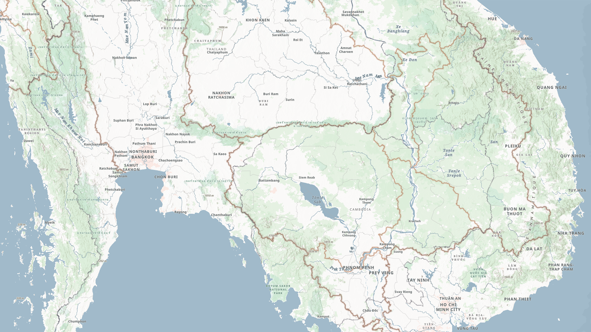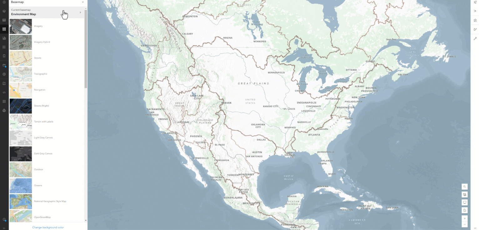 The Environment Map is also a complete Basemap, designed so the layers work together to best showcase your environmental content. This basemap de-emphasizes human landscape features, allowing the physical characteristics of the earth to take the spotlight, while also maintaining a neutral palette which helps illustrate the story within your data. A neutral palette allows you to see patterns and trends more clearly.