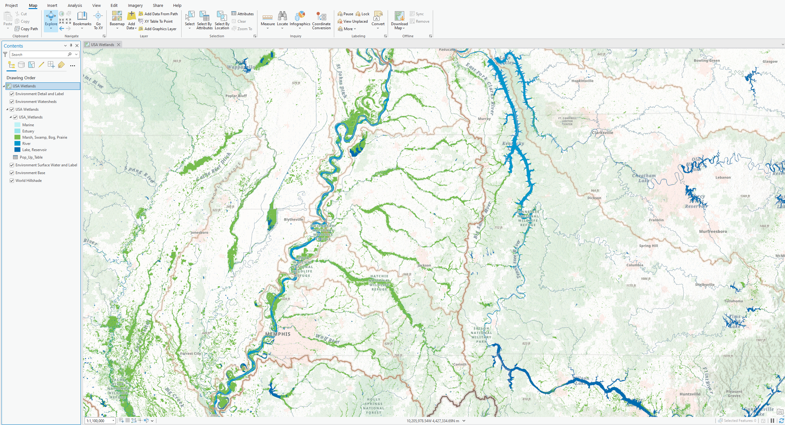 Access these layers in ArcGIS Online by expanding the Environment Map. The basemap was designed with four layers to provide the option to turn on or off specific features, tailoring the map around the type of environmental data you are displaying.