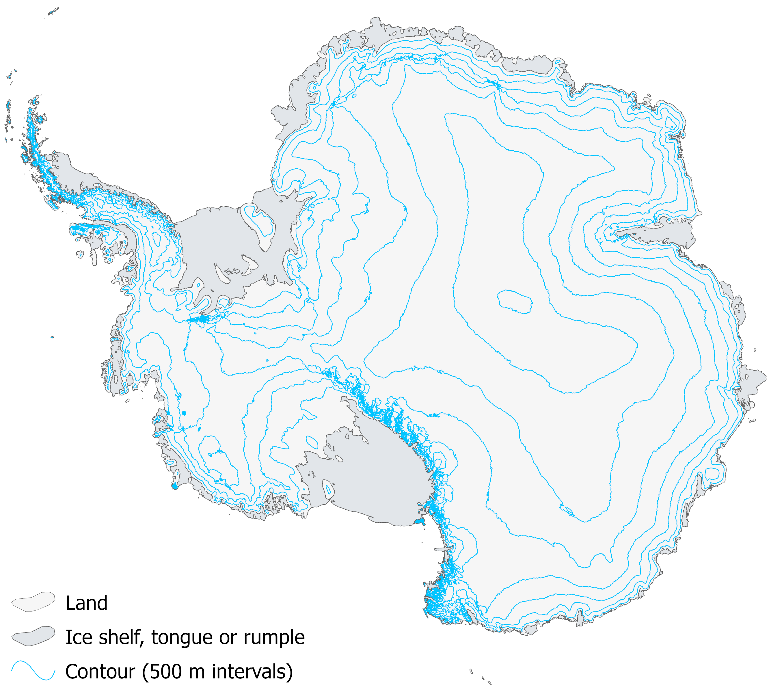 - Antarctic Contours – contains information of contour value (metres), source, source date and revision date at medium and high resolutions.