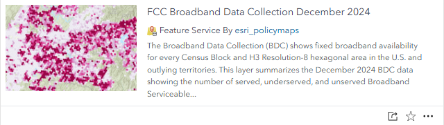 For more information about the Broadband Data Collection in ArcGIS Living Atlas of the World, please see this blog article.
