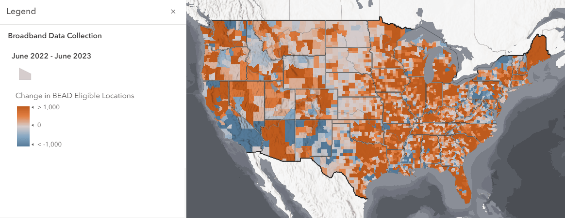 As with previous versions of the layer, the default symbology shows the number of BEAD eligible locations. A BSL is eligible for BEAD funding if it is unserved or underserved. The map above shows the change in the number of BEAD eligible locations from the June 2022 BDC release to the June 2023 release. You can investigate all of the changes for the three BDC releases with this interactive web map of US counties.