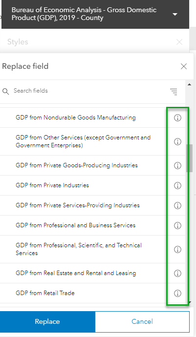 All these questions and more can be answered by viewing the industry definitions available through the layer’s long field descriptions. These long field descriptions are visible within the Map Viewer, so you don’t even have to leave your browser tab. When selecting an attribute to symbolize, simply click on the “i” information button next to each attribute: