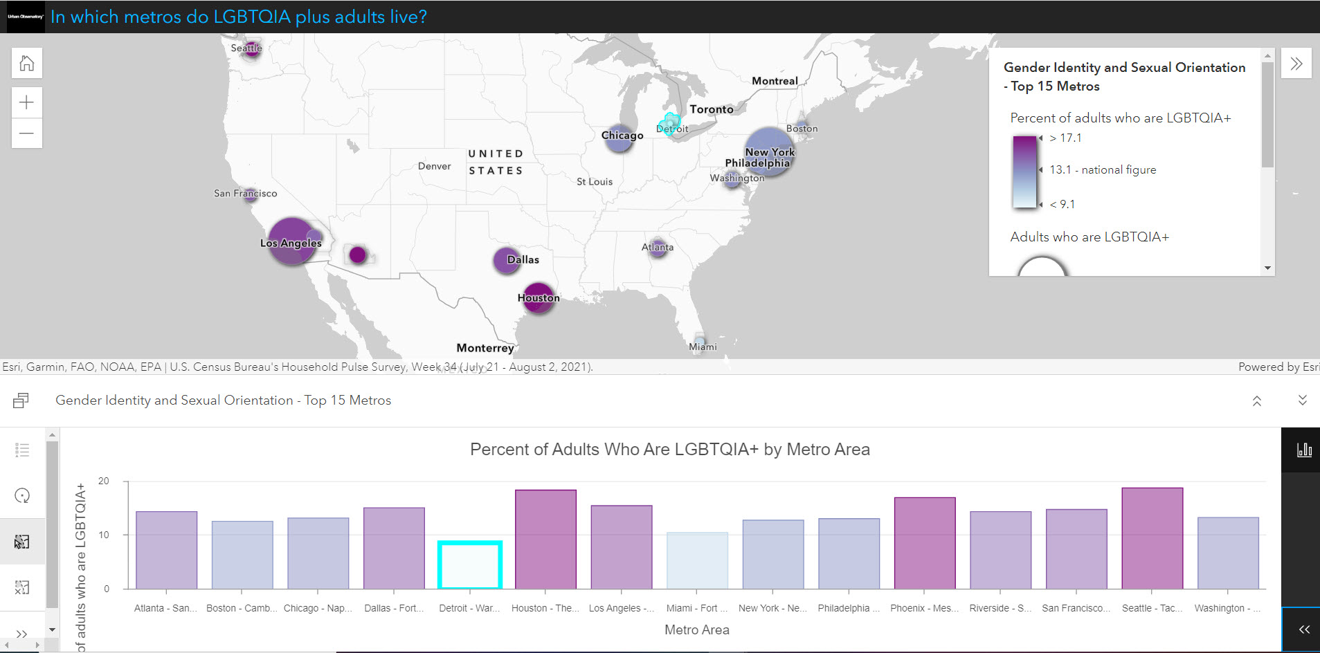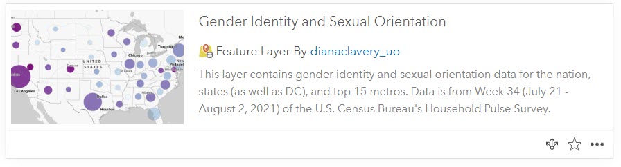 Data on gender identity and sexual orientation has been long awaited. Now, the wait is over! ArcGIS Living Atlas now contains a feature layer that shows Household Pulse Survey data on gender identity and sexual orientation for the nation, states, and the 15 largest metro areas. The Household Pulse Survey was designed to deploy quickly and efficiently, collecting data to measure household experiences, particularly during the pandemic. Data is collected by the U.S. Census Bureau, in collaboration with multiple federal agencies.