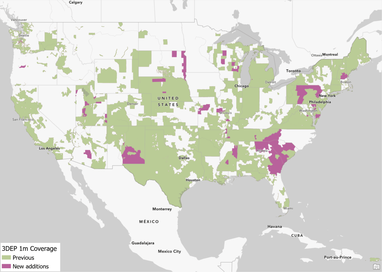 - Expanded coverage of USGS 3DEP 1 meter lidar derived DTM’s covering areas of the conterminous United States. In this release, approximately 376,000 square kilometers (~145,174 square miles) of new coverage of USGS 3DEP 1 meter has been added. The graphic below shows the new addition (magenta) along with previously available coverage (green).