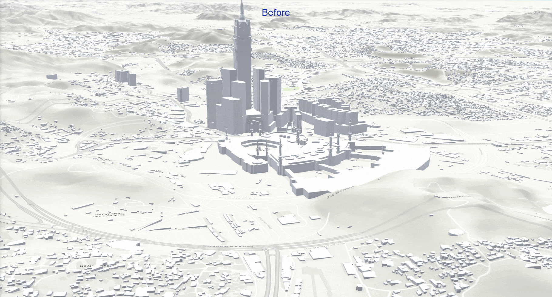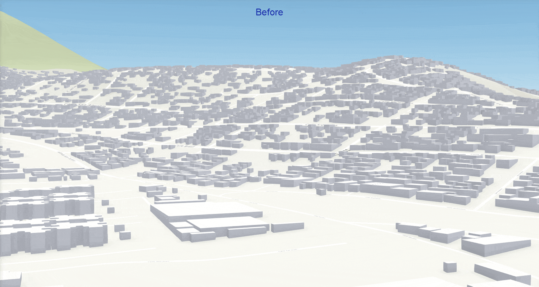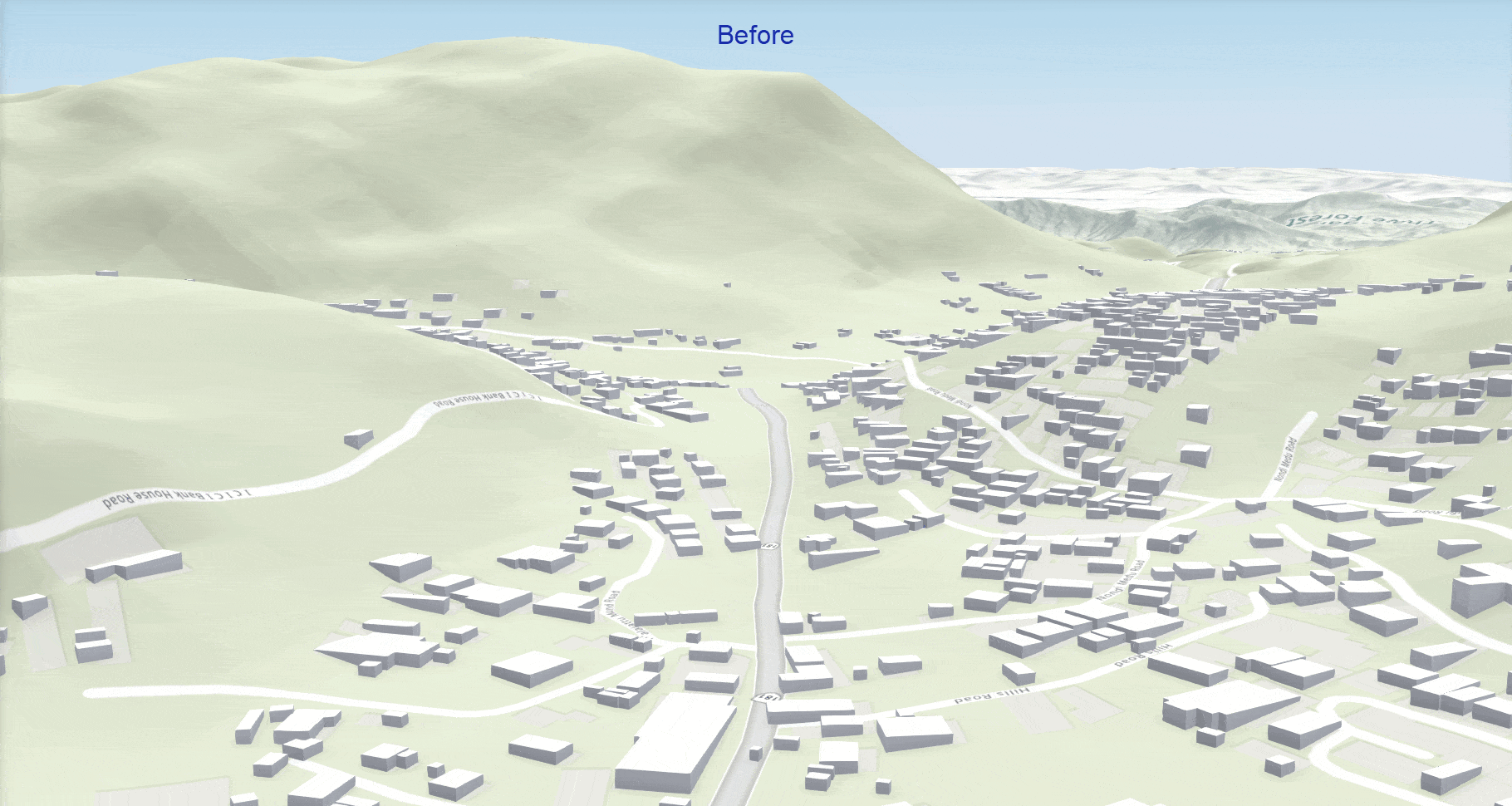 Let’s see a few enhancements in World Hillshade and Terrain3D with Maxar Precision3D in 50 cm. The 3D buildings in these examples are from Esri’s global building service, which is created from many data sources.
