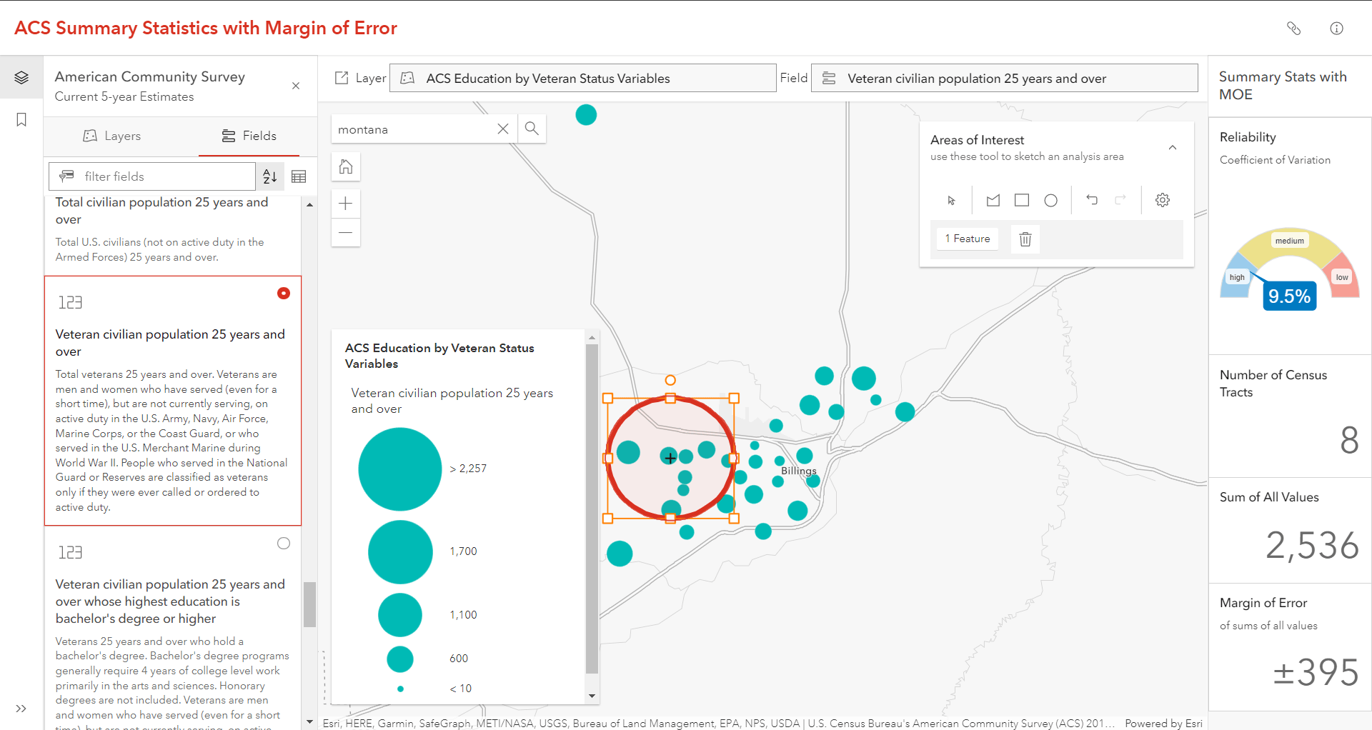 We created a Learn Path full of resources that walk through different ways to incorporate margins of error (MOEs) into maps. Recently released, this lightweight app helps you get a quick sense of how reliable estimates are for each tract, and how they become more reliable as you aggregate tracts using the boundary of a neighborhood or other shape. Check out this blog to learn more.