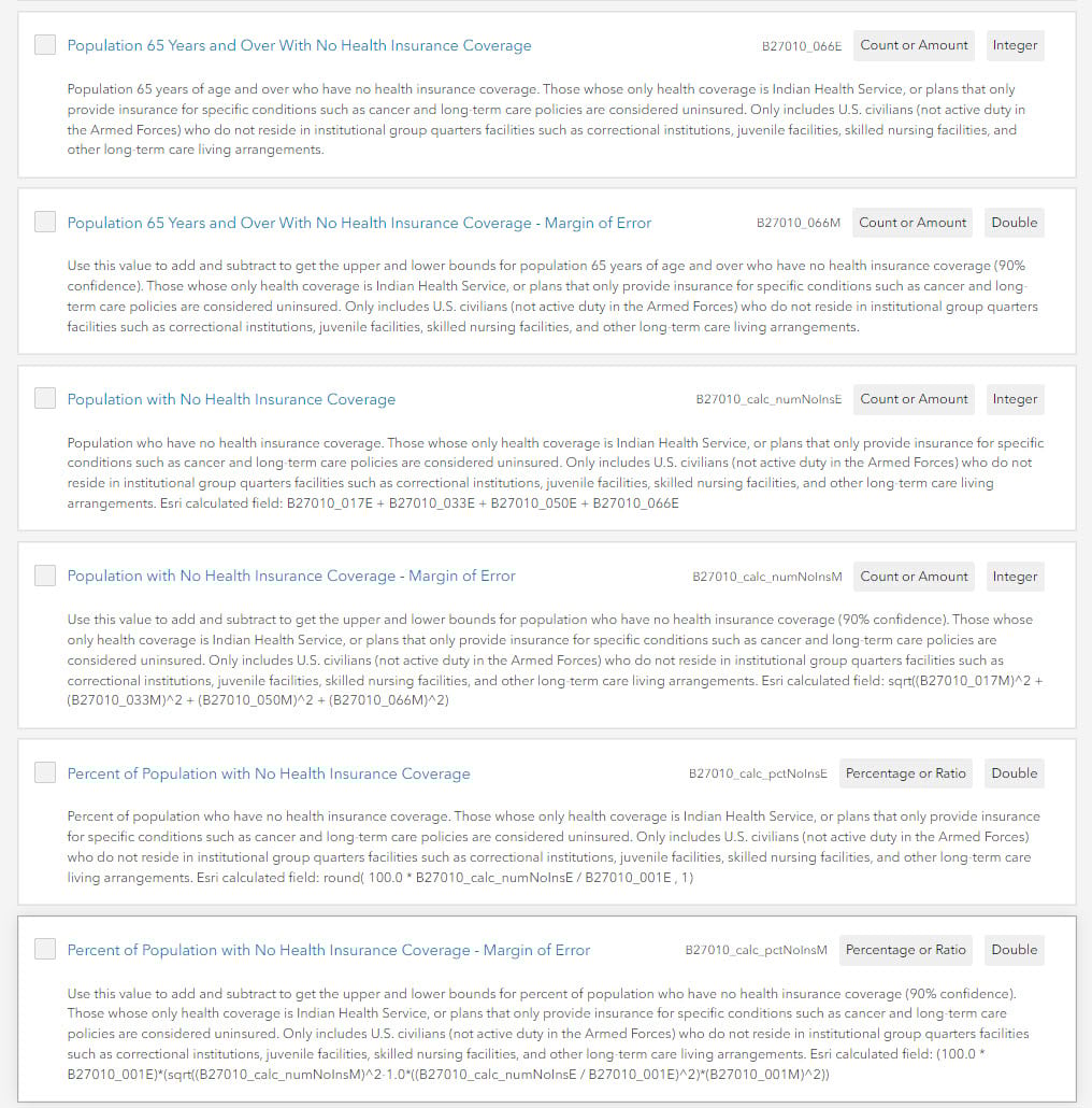 The 2017-2021 American Community Survey (ACS) five-year estimates are now available within ArcGIS Living Atlas. These ready-to-use layers save GIS users many hours of download and data processing time, and empower people to instantly begin to explore, map and analyze the data at state, county and tract levels. The layers can also be downloaded if needed.