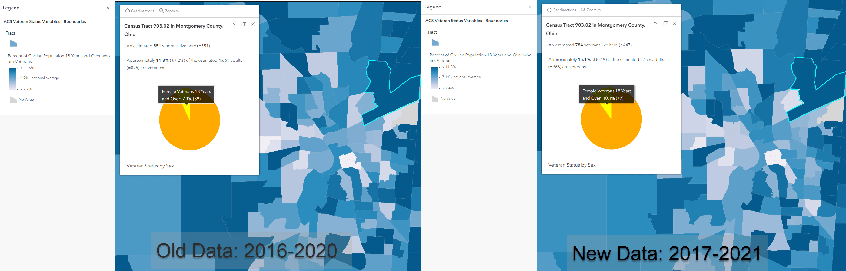 - Updated margins of error (MOEs) – All layers show MOEs in the pop-ups. By putting the MOEs subtly in the pop-ups, anyone can see the MOEs when needed, while those who are only interested in the estimates still see the layers’ symbology and pop-up as they’ve come to expect. For more information on MOEs, we created a Learn Path full of resources that walk through different ways to incorporate margins of error (MOEs) into maps.