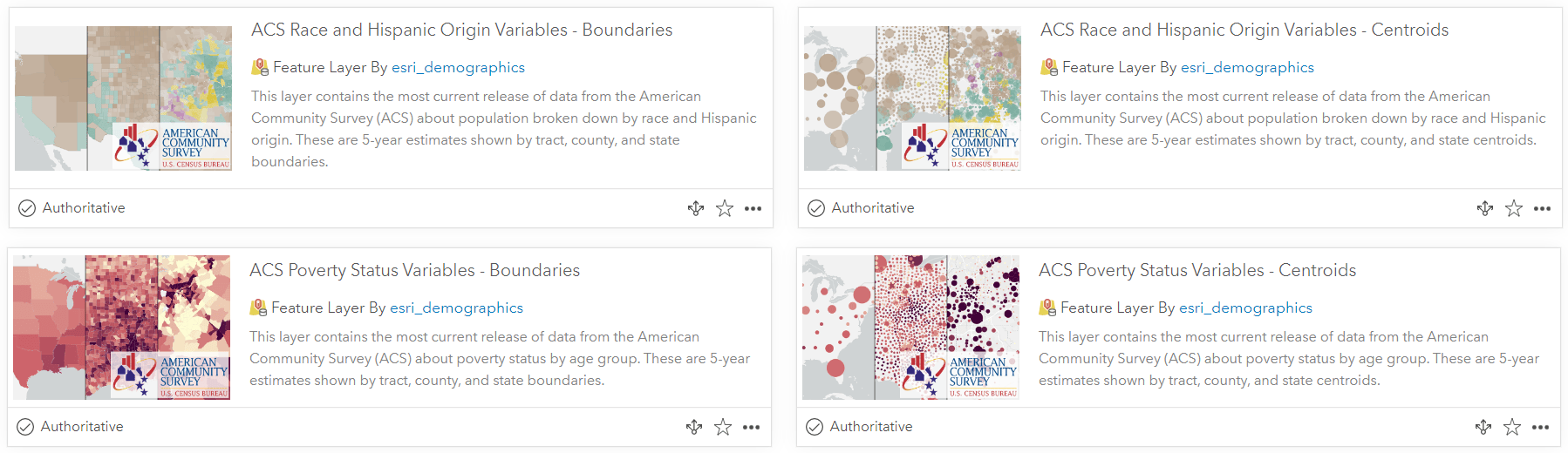 Since 2018, Esri’s Living Atlas Policy Mapping team provides to the GIS community a set of free layers that contain a wealth of data from the U.S. Census Bureau’s American Community Survey (ACS). On December 8th, 2022, Census released its updated five-year estimates (2017-2021). Within days of that release, the Policy Mapping team updated the ACS layers already available in Living Atlas with the newest figures. Maps and apps that already use these layers will automatically reflect the most recent Census ACS data.
