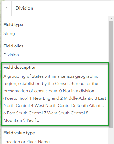 Another useful type of definition included in field descriptions when appropriate are definitions for coded values. For example, every census block, block group, tract, and county are contained in a state (or state-equivalent if in Washington, DC or Puerto Rico). This state is a field on the layers for lower levels of geography. Similarly, they are also contained within a census division. The coded values for the attribute “Division” range from 0 to 9. Here, the description serves as a codebook, exposing what division each of those values correspond to.