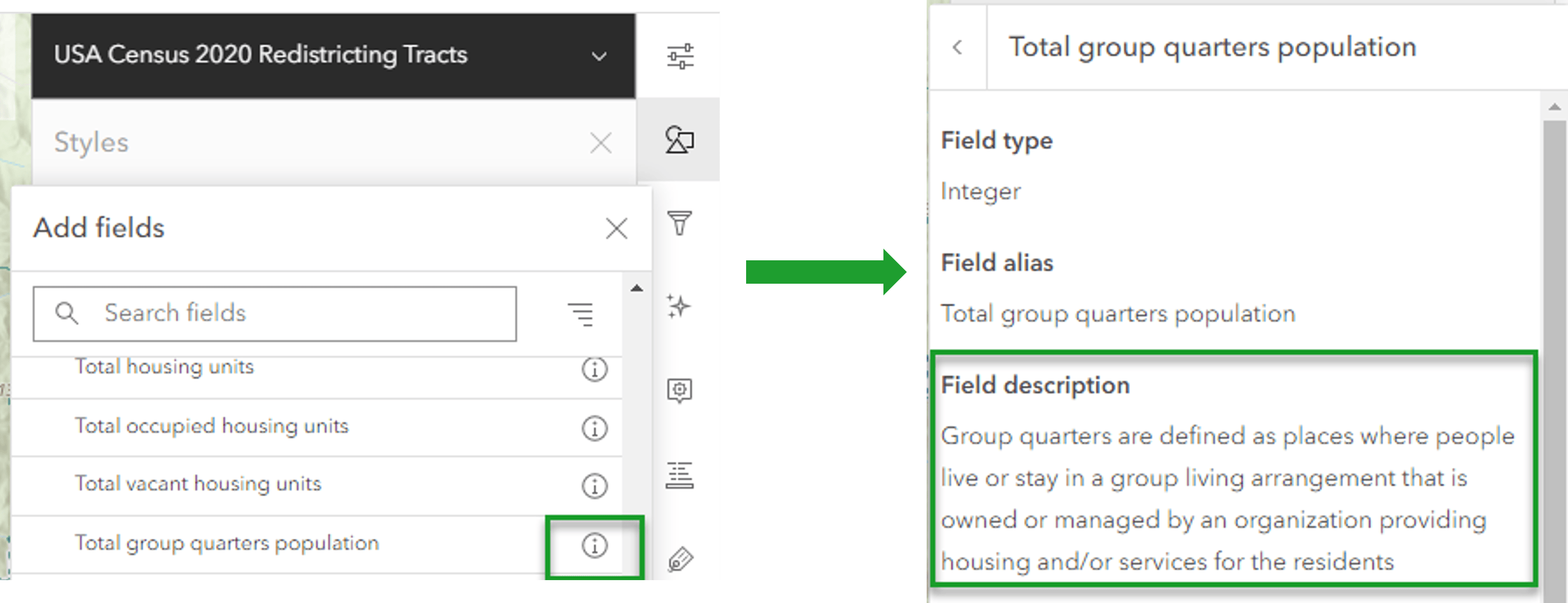 Here, I have the USA Census 2020 Redistricting Tracts layer in Map Viewer, and I see a field displayed as “Total group quarters population” in the fields list for styling the map. The “i” information button provides the definition:
