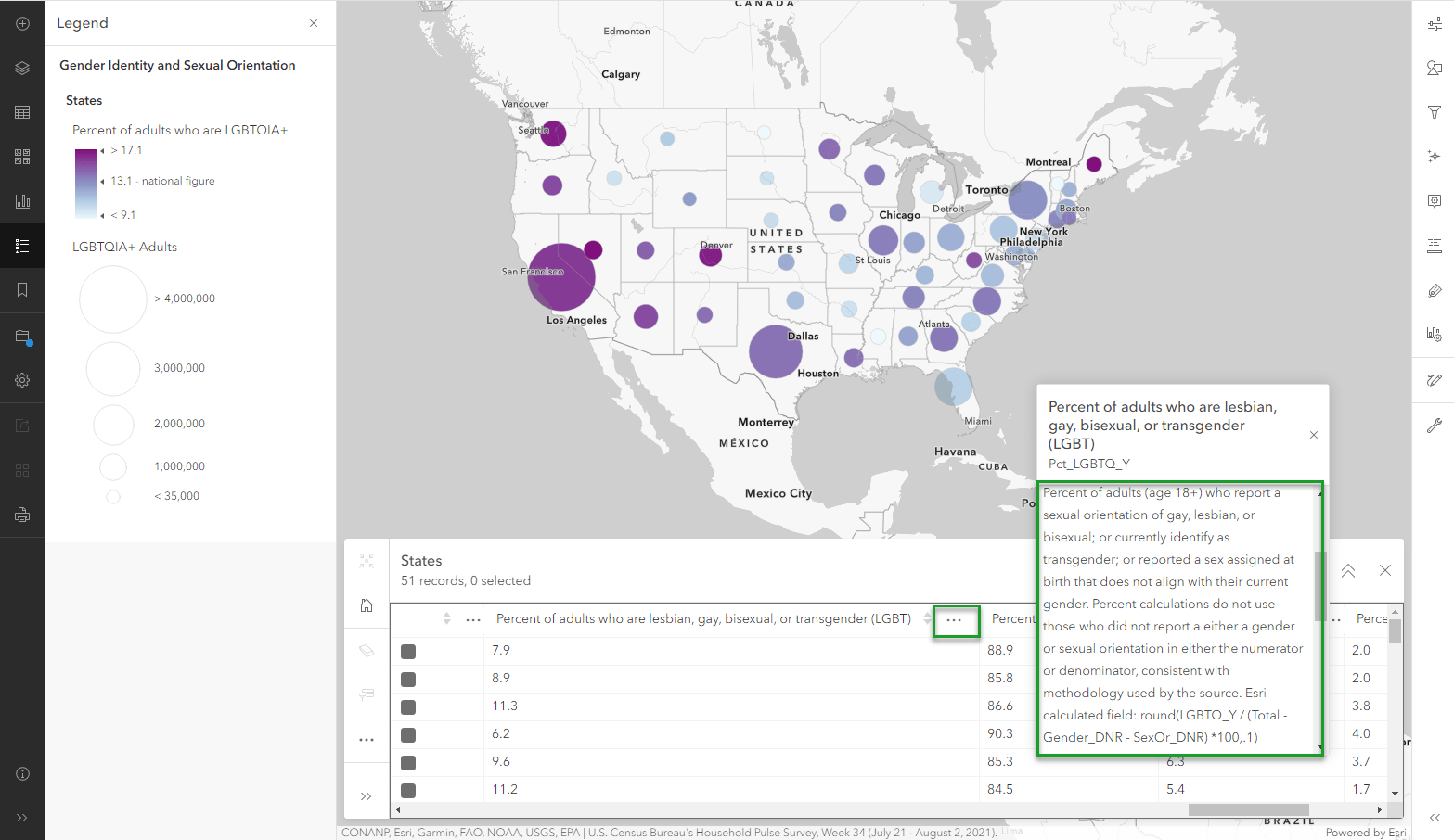 Working with calculated fields can be cumbersome and time consuming, because at times, my own calculations don’t match what I’m seeing on the layer I’m working with. I want to see the formulas used, since knowing exactly how a field was calculated can be extremely helpful. For example, this layer of Gender Identity and Sexual Orientation does not include those who did not report certain characteristics in either the numerator or denominator of percent calculations. Just as you can explore these field descriptions by clicking on the “i” information button in the Style Options, you can also do this by clicking the “…” (more options) -> “i” button on a specific field in the attribute table.
