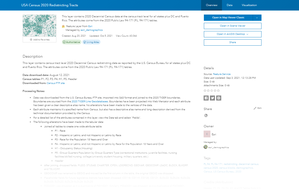 The U.S. Census Bureau released block-level data on August 12th, 2021, in accordance with Public Law 94-171. Two weeks later, a feature layer with all 8,174,955 blocks was available in ArcGIS Living Atlas of the World, along with layer views for each state. Additional geographies (states, counties, tracts, block groups, etc.) were released shortly after, using the same processing methods. These layers are readily available to be accessed and used within typical GIS workflows or redistricting efforts throughout the country.