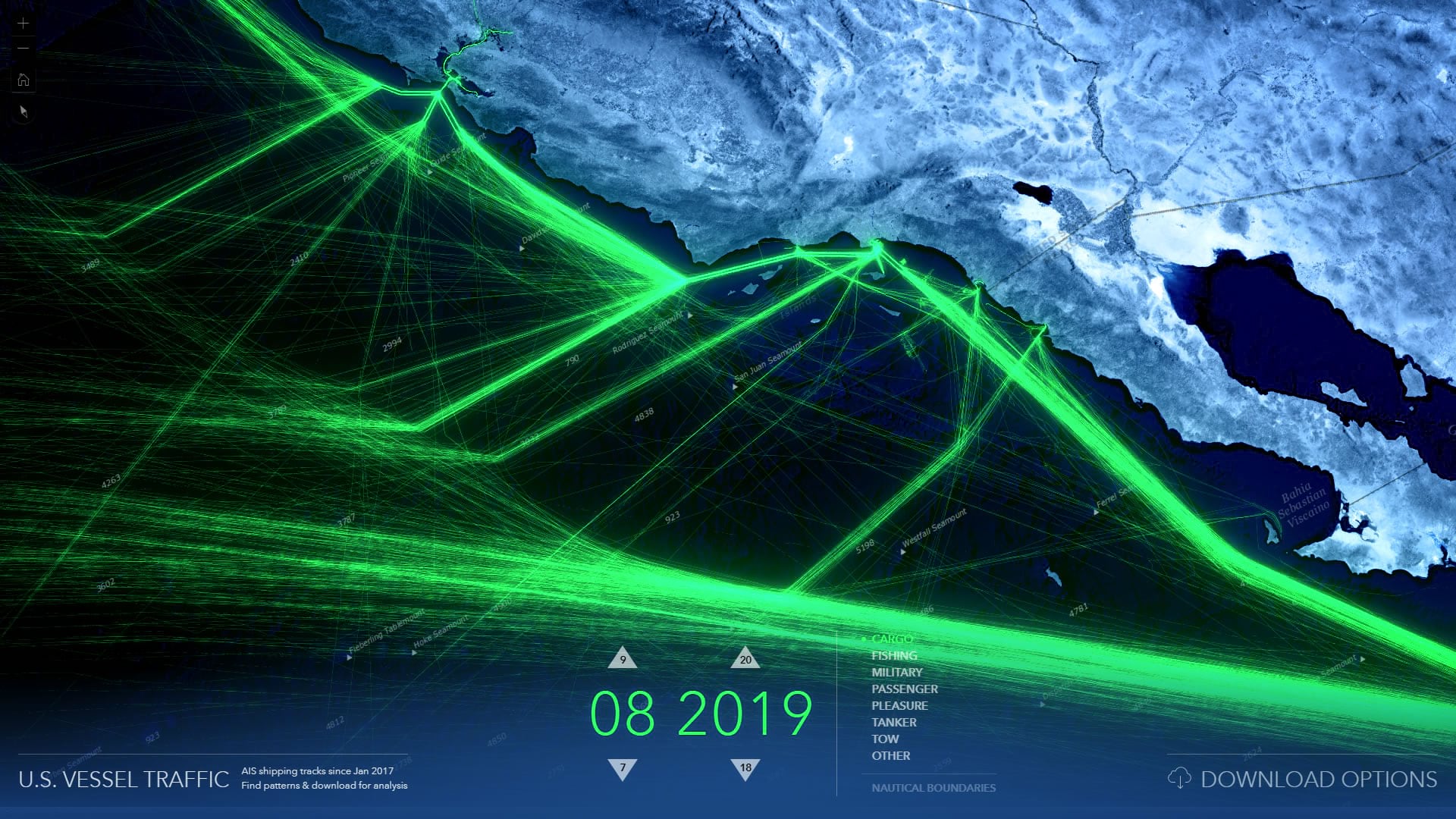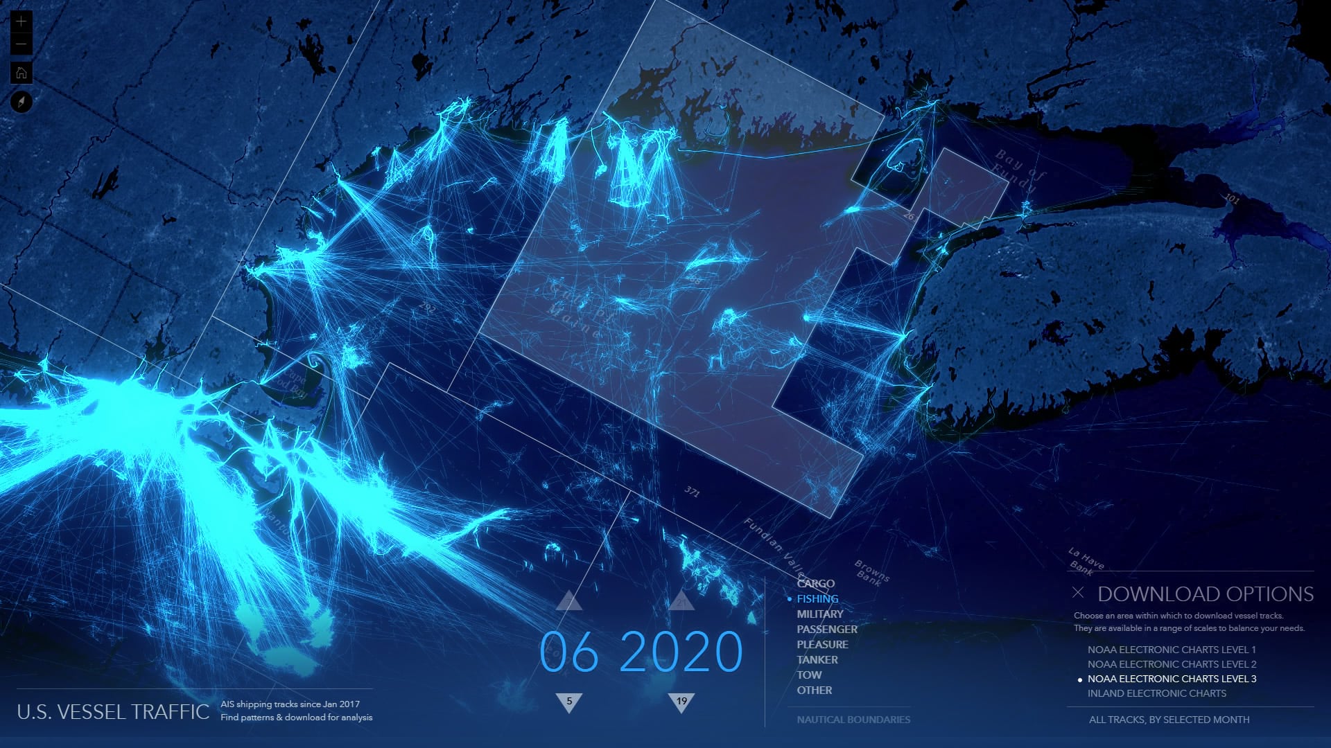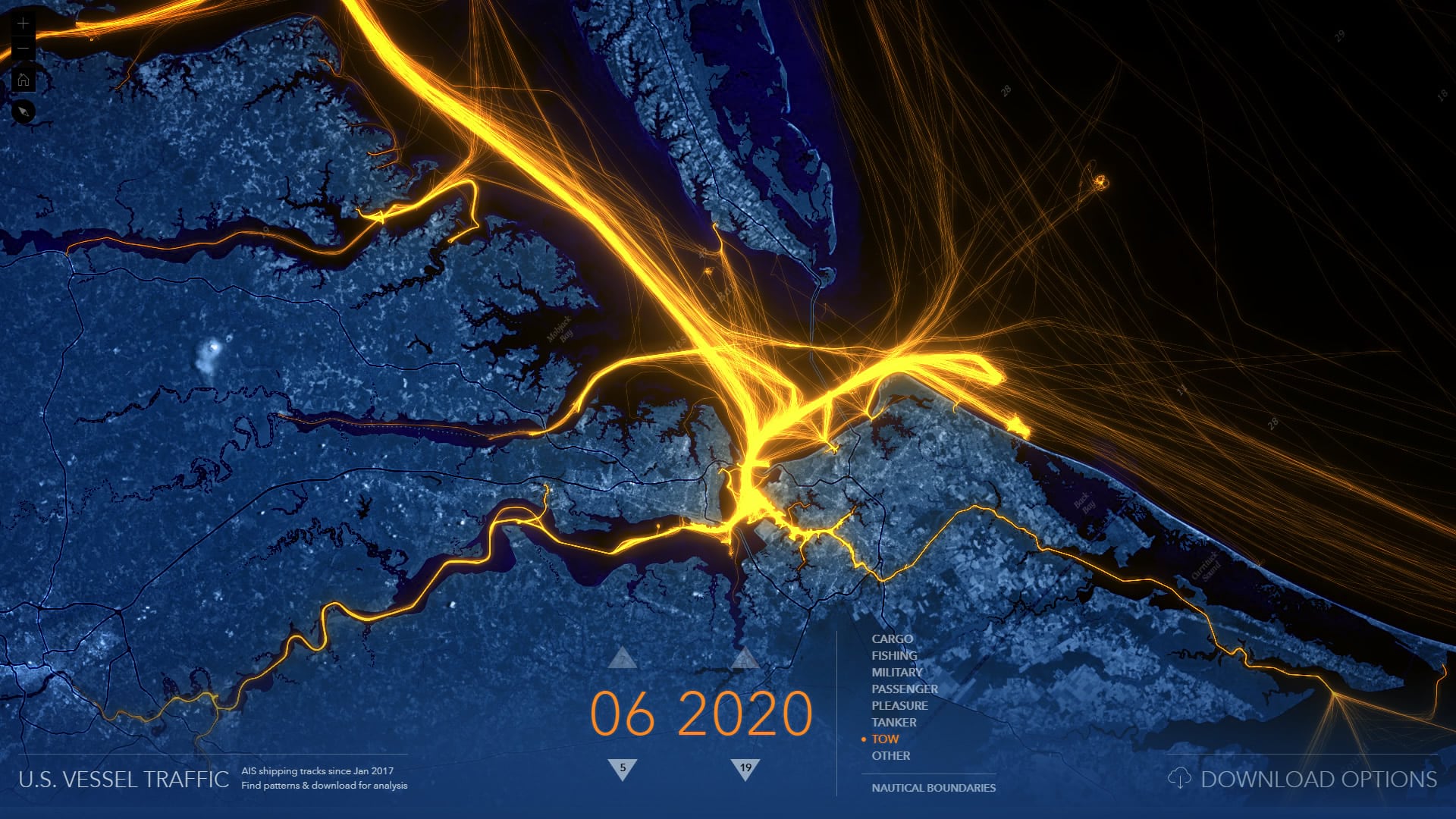 The Living Atlas U.S. Vessel Traffic application is a new and fun tool that lets you explore the paths of vessels in and around U.S. waters, look for patterns and trends by time, vessel type, and place, and it provides a simple and efficient way to download manageable-sized, area-specific, excerpts.