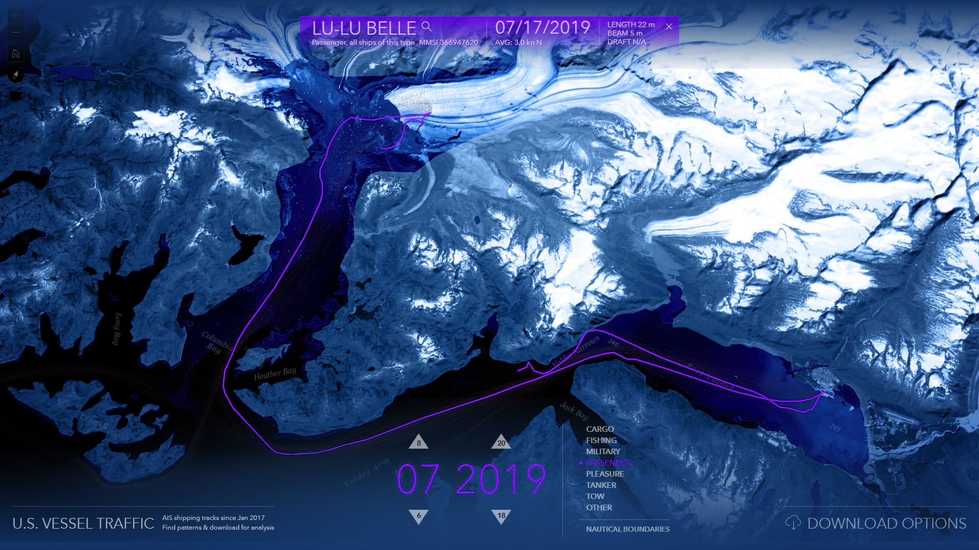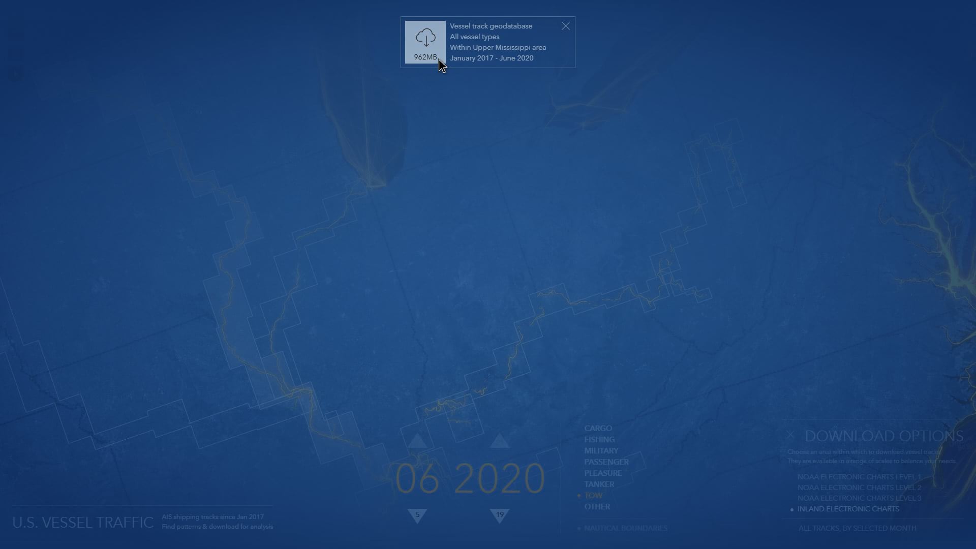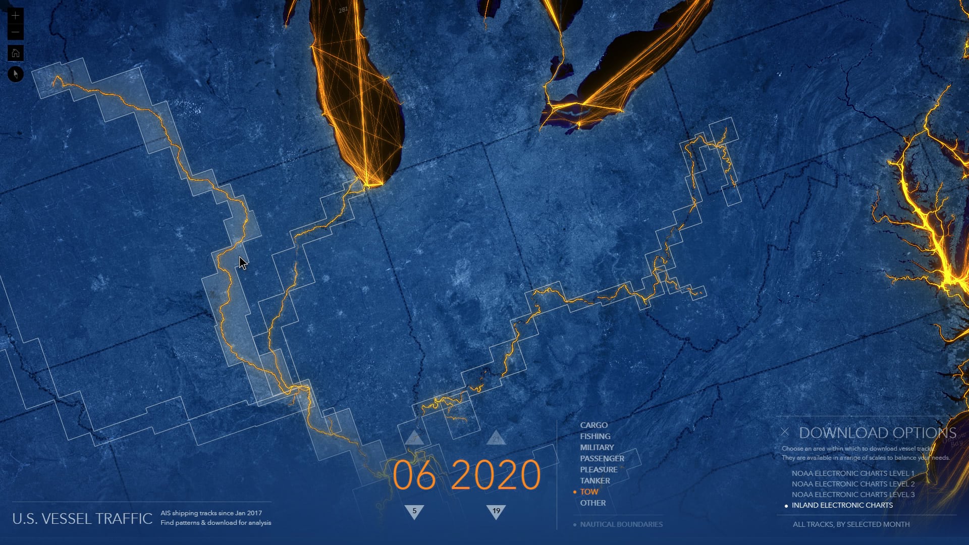 The Living Atlas U.S. Vessel Traffic application is a new and fun tool that lets you explore the paths of vessels in and around U.S. waters, look for patterns and trends by time, vessel type, and place, and it provides a simple and efficient way to download manageable-sized, area-specific, excerpts.