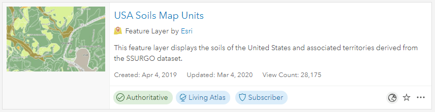 Typical search results contain the thumbnail, title, summary, and other information about the layer.