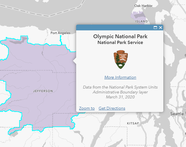 Below the logo is a link to Olympic National Park’s web page followed by details about the source and vintage of the data in small, light-gray font. The design leads the viewer’s eye from top to bottom. The user is lead to the top, reads down and can disengage at any point depending on their level of interest in this feature.