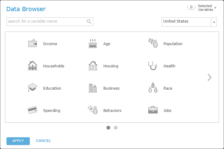 I click on Select Variables to see the Data Browser, which categorizes thousands of demographic variables available for the United States. Using the Population and Income categories, I choose variables that will help me understand the people living in this area. I choose Apply when I am done selecting my variables.