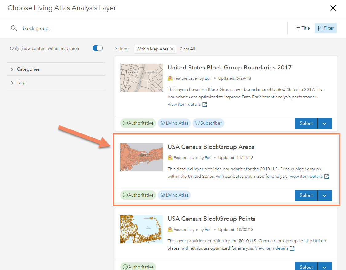 When I want to simply see the demographics of an area, I choose block groups, because they provide the smallest and most detailed geographic boundaries. Since I do not have these boundaries, I select the “Choose Living Atlas Analysis Layer”. I can see that these are Authoritative boundaries, so I choose to use the USA Census Block Group Areas layer.