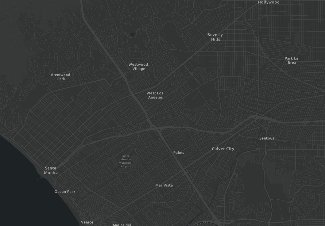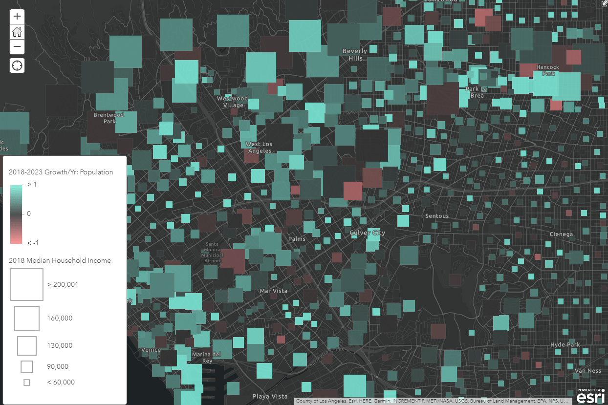 Using the search bar within the map, zoom to any area you are interested in exploring. For this example, I will go to western LA, because I am interested in exploring growth and income in this area. I always change the basemap to a neutral basemap such as the Dark Gray Canvas. Why? A neutral basemap makes demographic maps easier to interpret and understand.