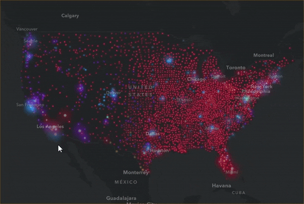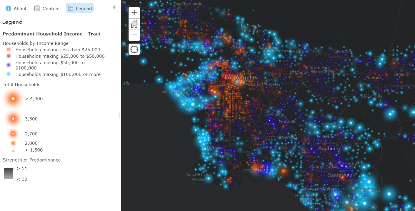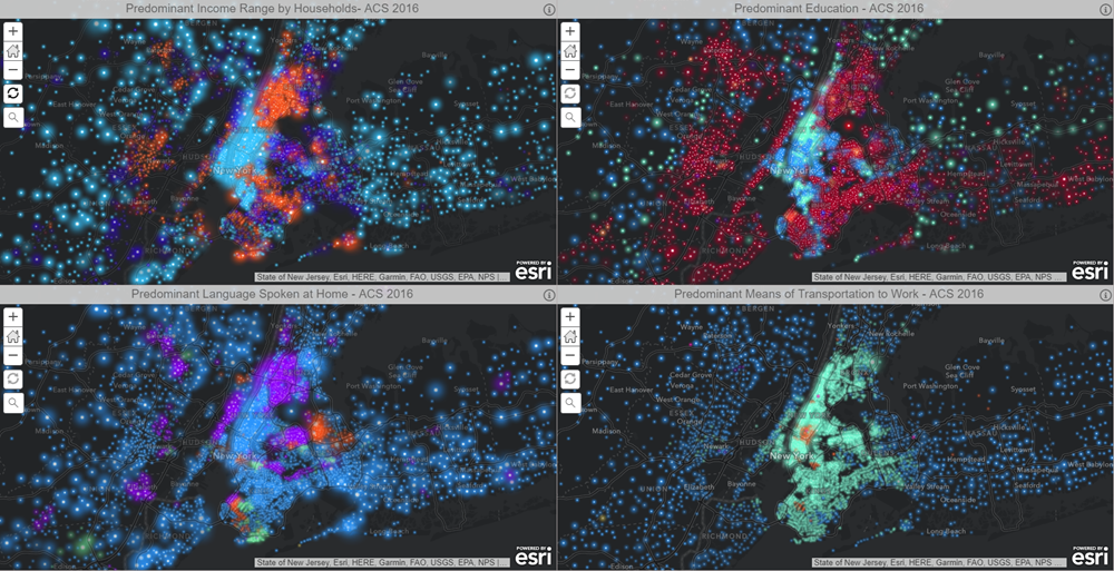 This map groups households into four income ranges and shows the group with the highest count of households. This mapping technique is known as predominance, and can easily be done in ArcGIS Online within the Change Style settings. This technique highlights the predominant income range, and the symbol’s brightness depends on how predominant the range is over the other categories (strength of predominance). This map helps us understand the distribution of income, and has interesting patterns of wealth and poverty, especially in large cities like New York City, Los Angeles, and Chicago.