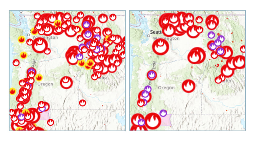 For example, the California Historical Fire Perimeters layer contains three sublayers to help you easily visualize all fires over time, the recent fire perimeters over 5000 acres within the past 5 years, or fire perimeters by decade. The layer also contains easy-to-read alias names for each data attribute and meaningful labels at appropriate scales to help you utilize this layer within your own mapping and analysis projects. For the recent fires sublayer, there is also a scale-dependent label that helps visualize where the most recent fires occured and how many acres burned.
