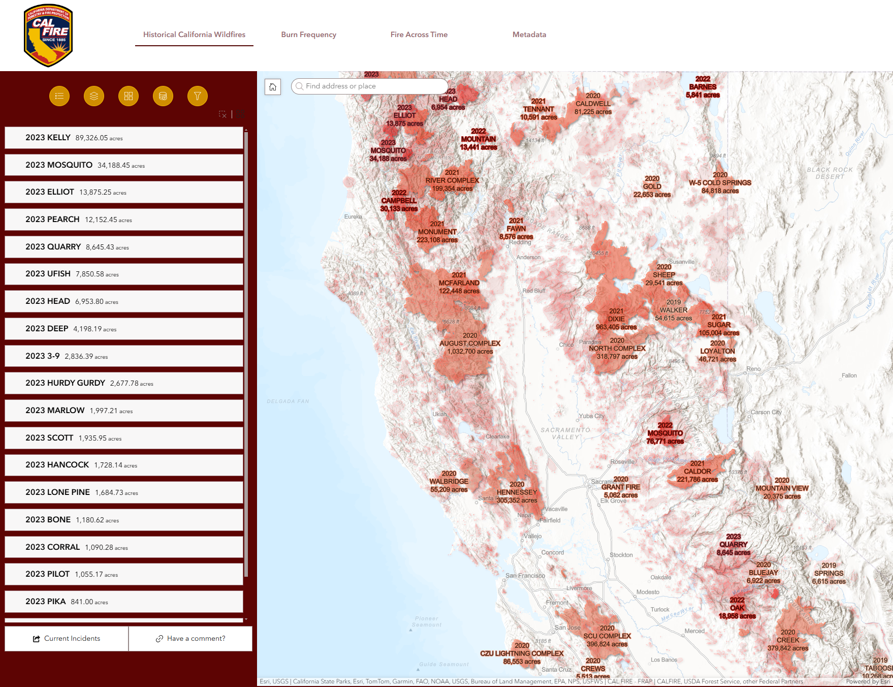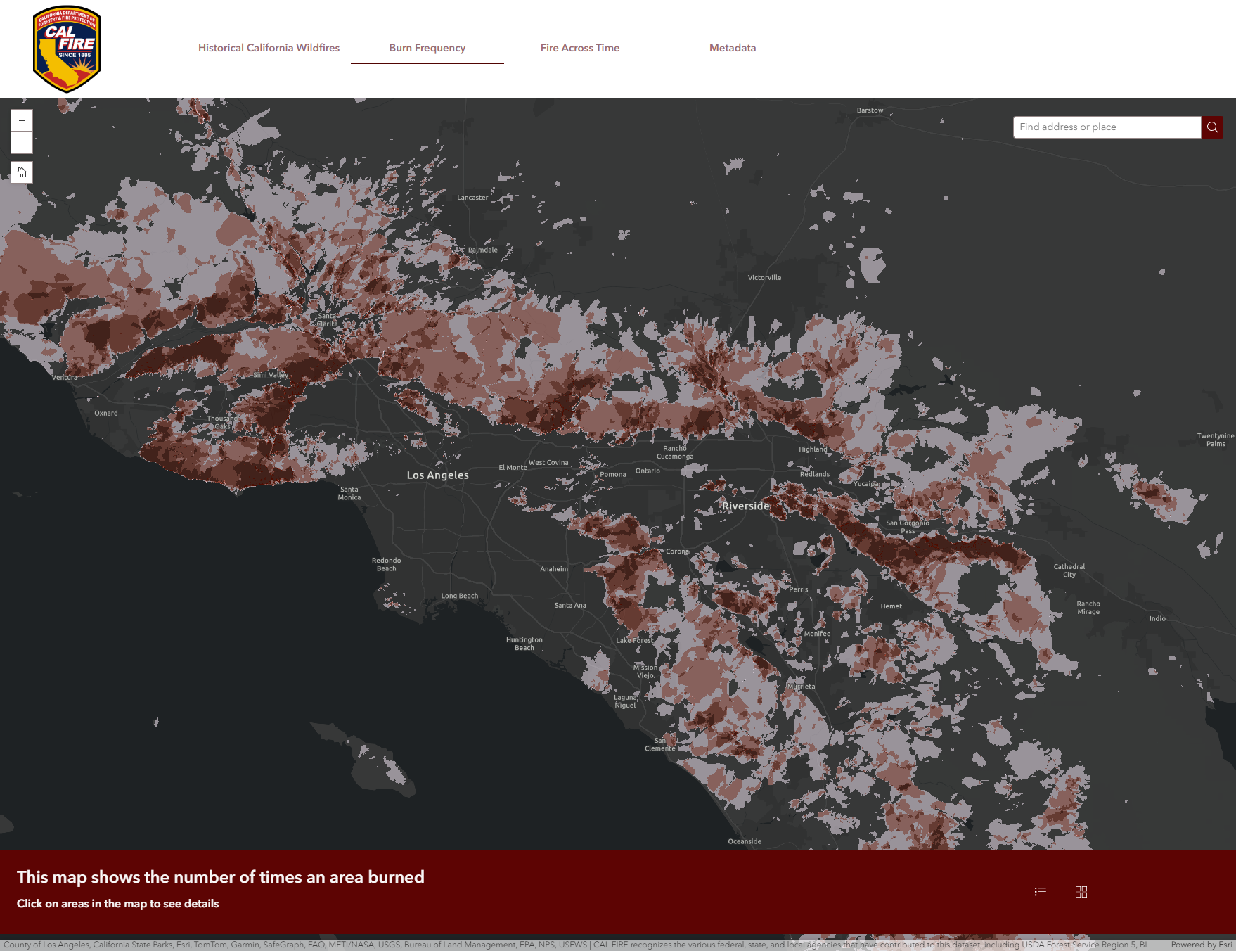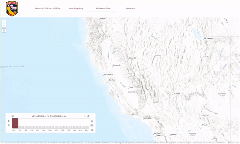 This app provides a user friendly experience to interact with CAL FIRE’s historical fire perimeter dataset. Users can add their own data, filter, or explore the perimeters against several other authoritative layers. The app utilizes a time enabled layer for users to view the perimeters across time and show cases a burn frequency analysis produced annually in hand with the perimeter dataset. Learn more about the agencies involved, the cause of an indicent, how often an area has burned, or overlay incidents with vegetation types. This app provides a comprehensive experience to explore patterns over time, and ask spatial questions about fire history.