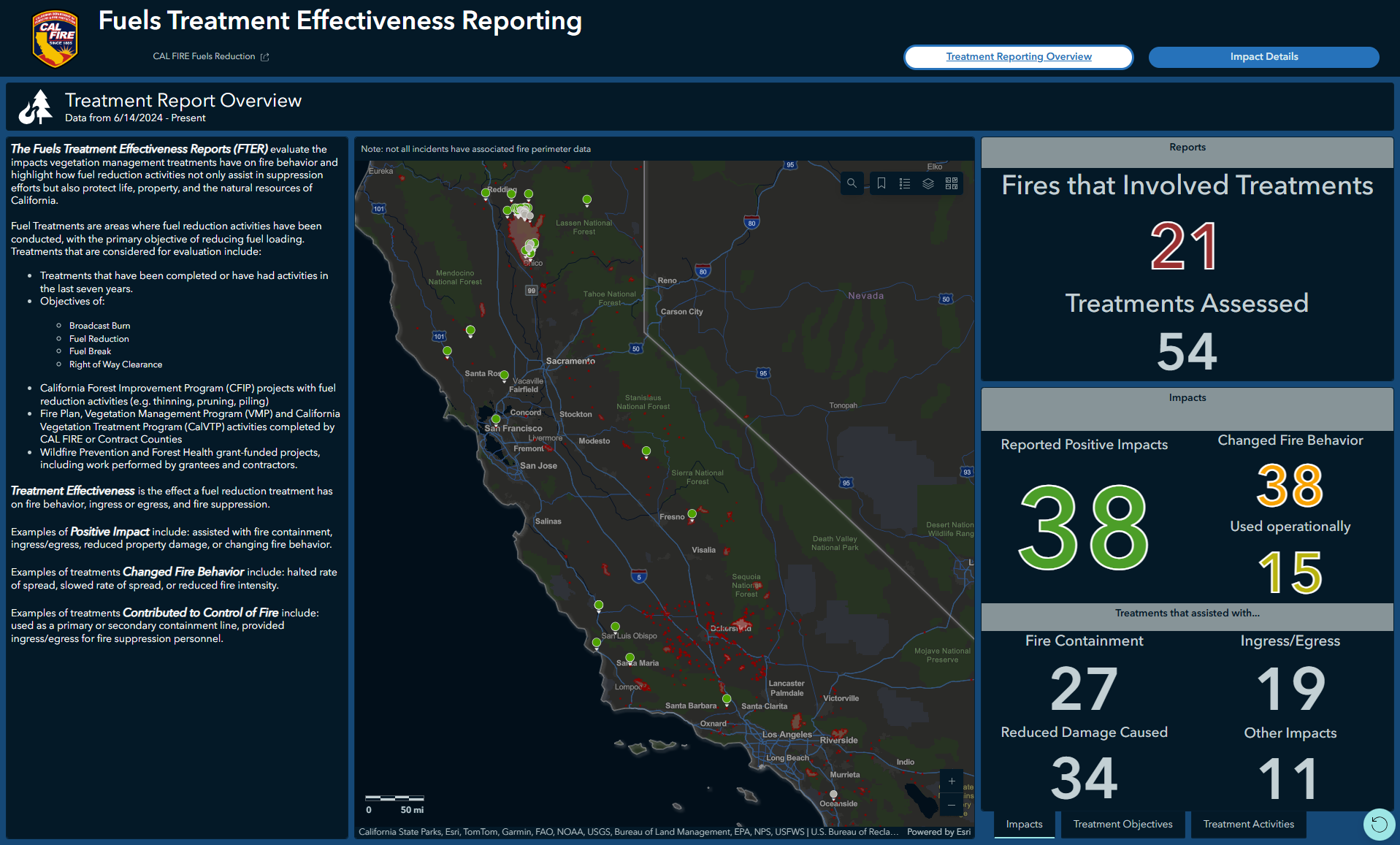 The Fuels Treatment Effectiveness Reports (FTER) Dashboard provides a look at how CAL FIRE is evaluating the impacts vegetation management treatments have on fire behavior and highlight how fuel reduction activities not only assist in suppression efforts but also protect life, property, and the natural resources of California.