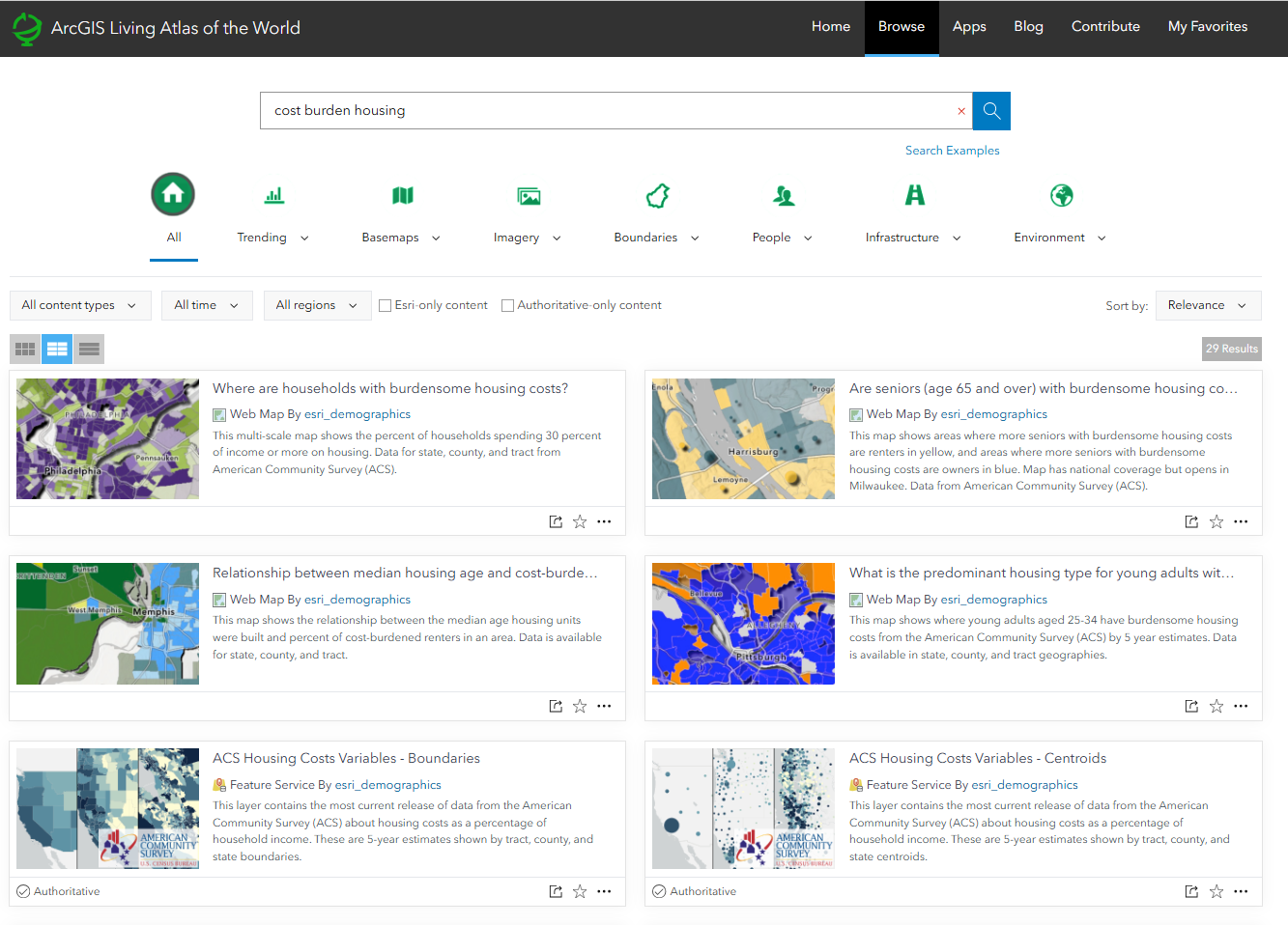 While using your own local data of your organization is best, ArcGIS Living Atlas provides a vast collection of curated, ready-to-use geographic content (layers, maps, apps) from Esri and thousands of organizations that can be used to help you create your Map Portfolios. Living Atlas content can help supplement your local data to help better present your topics of interest, or if you don’t have local data for your topics of interest, Living Atlas content can be used for the entirety of your Map Portfolios. For example, if you wanted to focus on where area with burdensome housing, you can search ‘cost burden housing‘ in Living Atlas, and use a ready-to-use web map titled ‘Where are households with burdensome housing costs?’