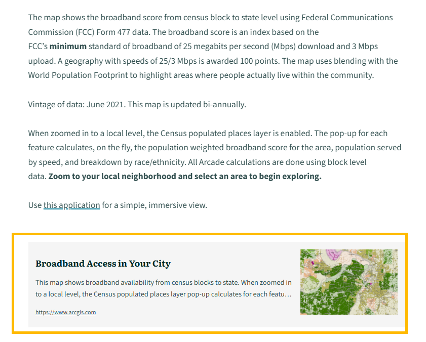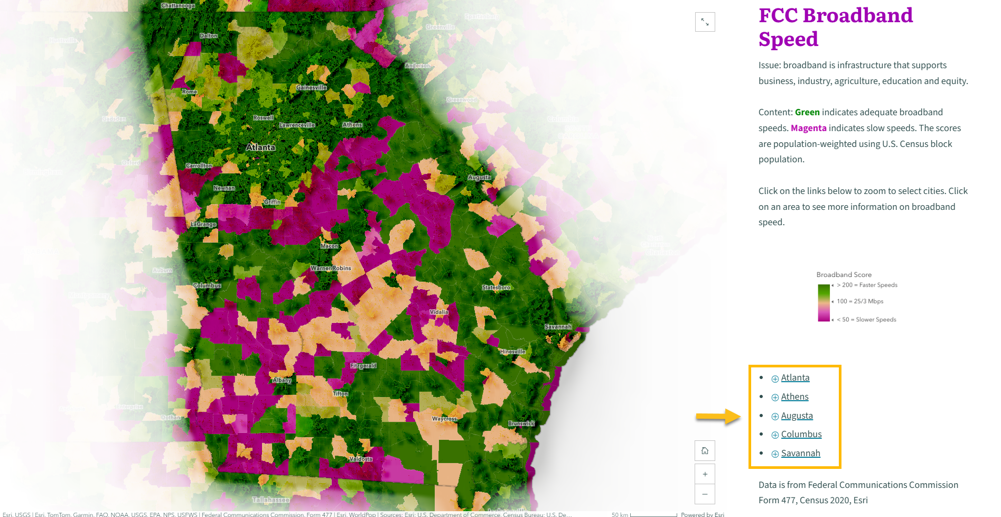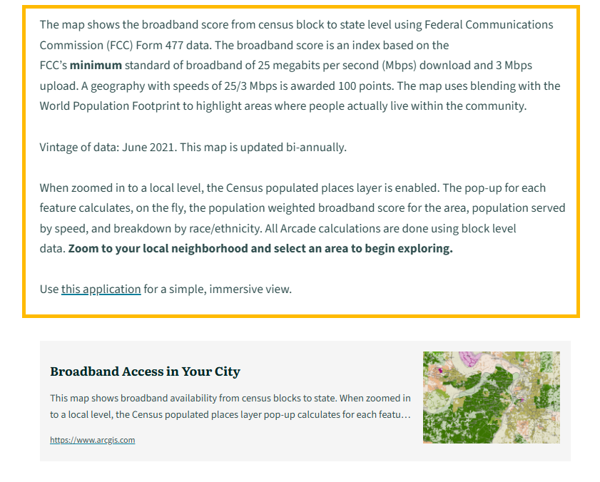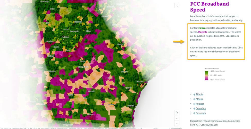 After creating your first StoryMap, repeat this process for additional topics aligned with executive priorities. Add all of these StoryMaps to an ArcGIS StoryMap Collection to create your completed Map Portfolio. For example, you can view the completed Georgia Map Portfolio, which includes 22 StoryMaps—one of which is the broadband access example used above—at the link provided.