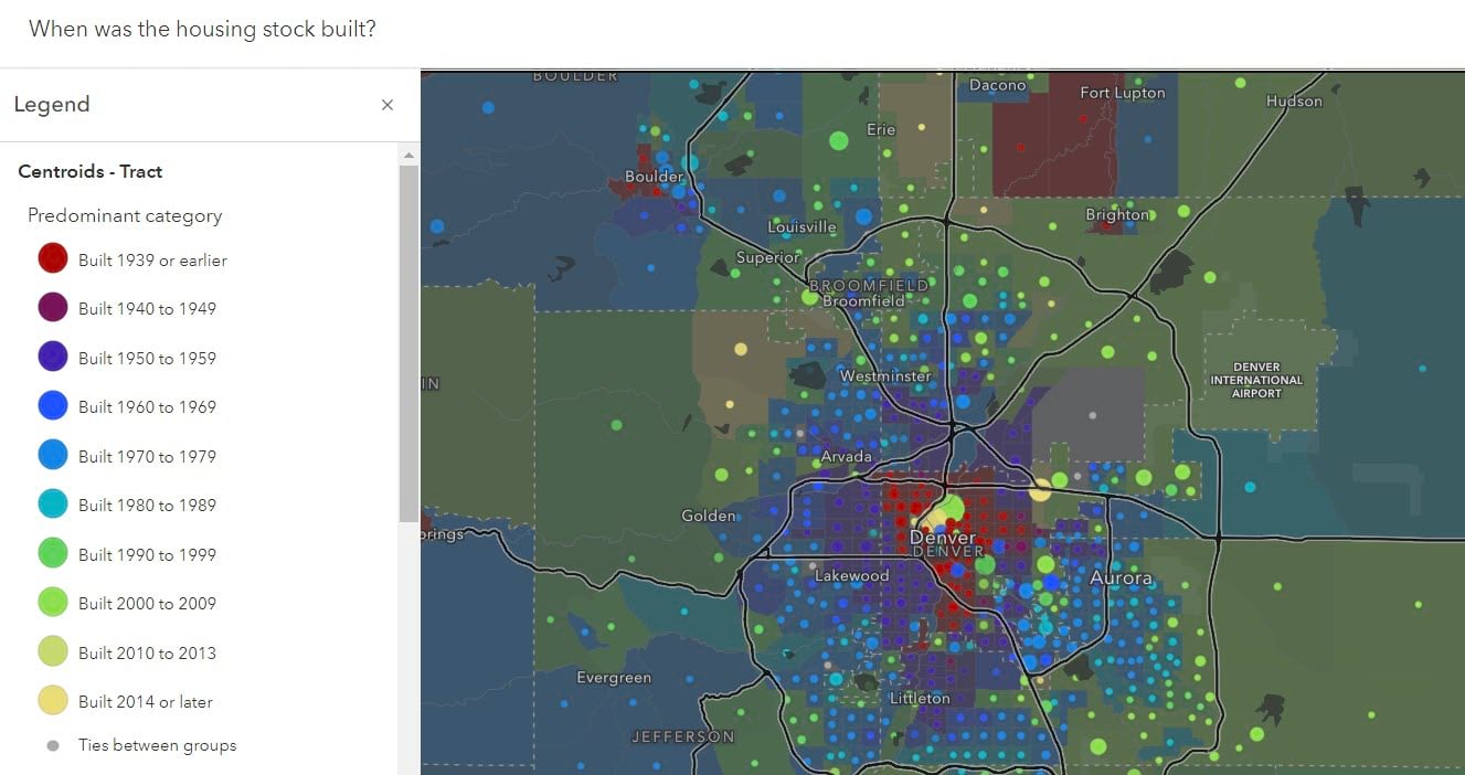 If your data has multiple date fields, a predominance-style map can also answer the question of when. This predominance map titled When was the housing stock built? shows the most common decade that homes were built in a given area. Because these decades have a natural order to them, the color ramp used in this predominance map also has a natural order to it. This is often referred to as sequential predominance.