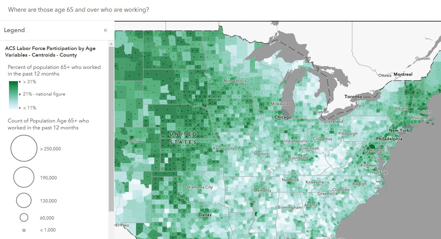 Notice this map is not called Labor force participation by age by census tract. That is a great name for the tabular data and even for the layer. Maps are more audience-facing, so the map ought to convey the question that it answers clearly. An economics major will know what labor force participation is, but a decision maker will likely be less familiar with this term. Also, a dataset such as Labor force participation by age by census tract can answer numerous questions. Why not create a focused map for each question you need answered?
