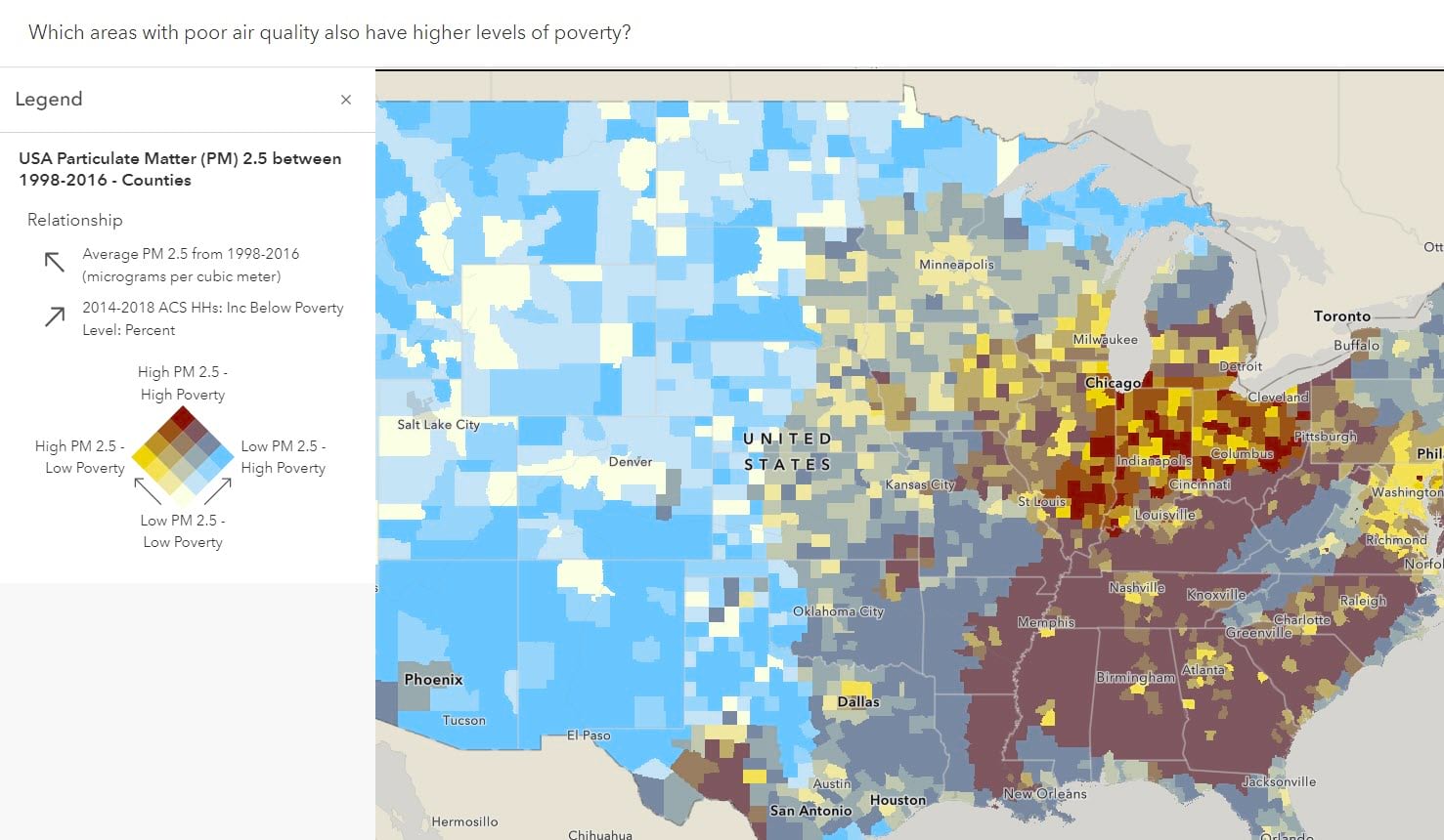 Relationship-style maps display two attributes together on the same map, and reveal areas that are high in both and low in both, as well as the off-diagonals: high in one attribute but low in the other, and vice versa. Fundamentally, they describe how two things related. For example, Which areas with poor air quality also have higher levels of poverty?