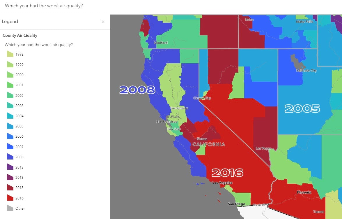 Another map that uses sequential predominance for single year categories answers the question, Which year had the worst air quality? It’s mapping the year with highest average annual particulate matter 2.5 (PM 2.5), and that information is clear the in pop-up. This map also uses labels effectively to communicate the year with the worst air – the question that the map was created to answer.