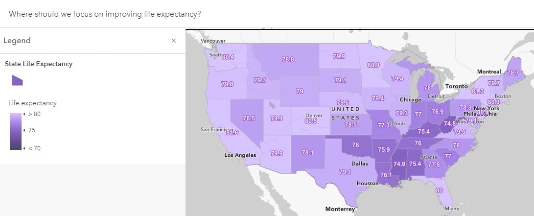 This map was created to highlight areas in need of change. The symbology in this map is inverted so that lower life expectancy – more in need of investment, programs, and so on. The map’s title reinforces this map’s purpose by the phrase, Where should we focus on improving outcomes.