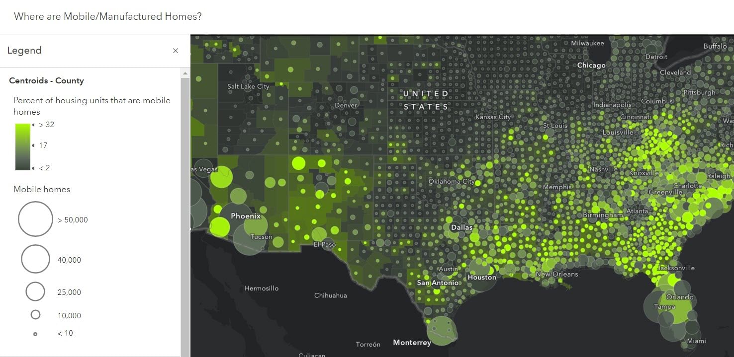 A simple map of counts or percentages can become a captivating mini-headline. Instead of Count and percent of mobile/manufactured homes by county, it’s Where are these things? Your map’s audience might start to wonder, Are they near me? Are there any in my community? They’ll be more likely to be engaged after reading the title.