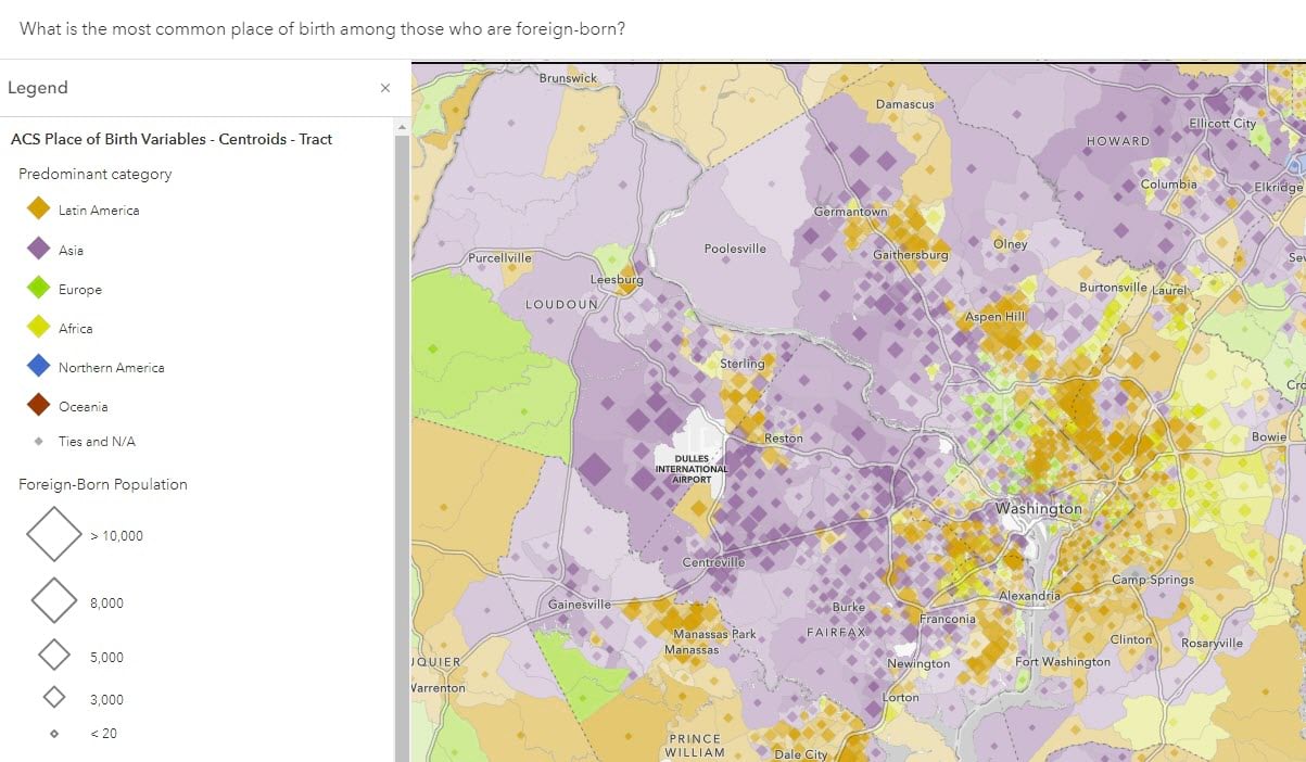 Predominance-style maps such as this one display the attribute field with the highest value, or the most common group. Contrasting colors depict the various groups. What is the most common place of birth among those who are foreign-born? is one example of this.